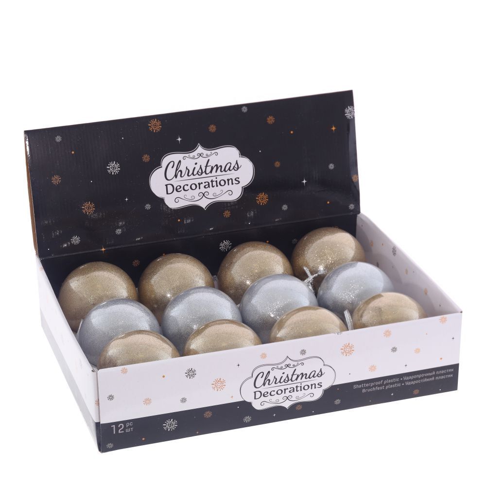 Набор из 12-ти шаров для елки в шоу-боксе. Эти новогодние шары из пластика, непременно порадуют вас своим изяществом и прекрасно дополнят праздничный наряд лесной красавицы.