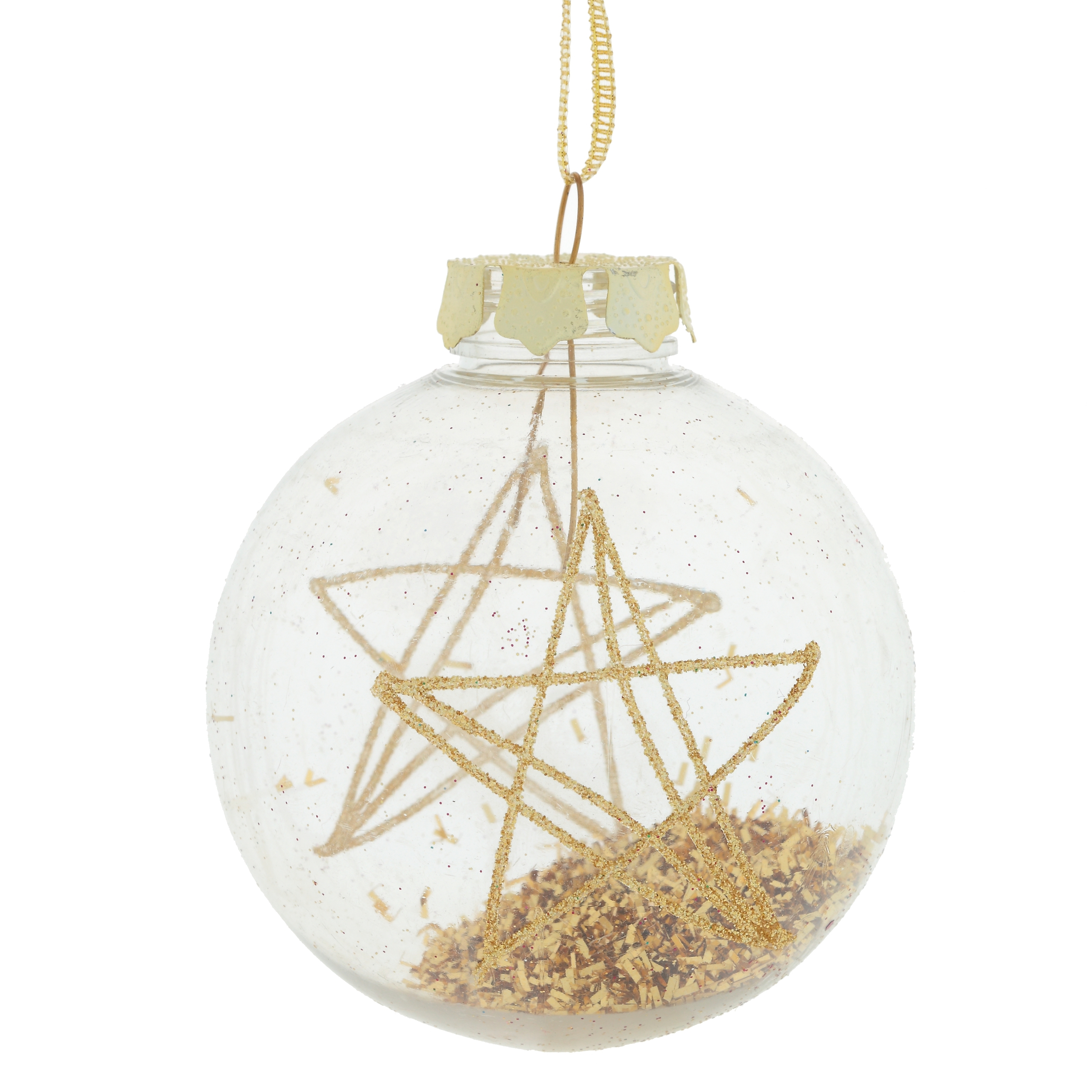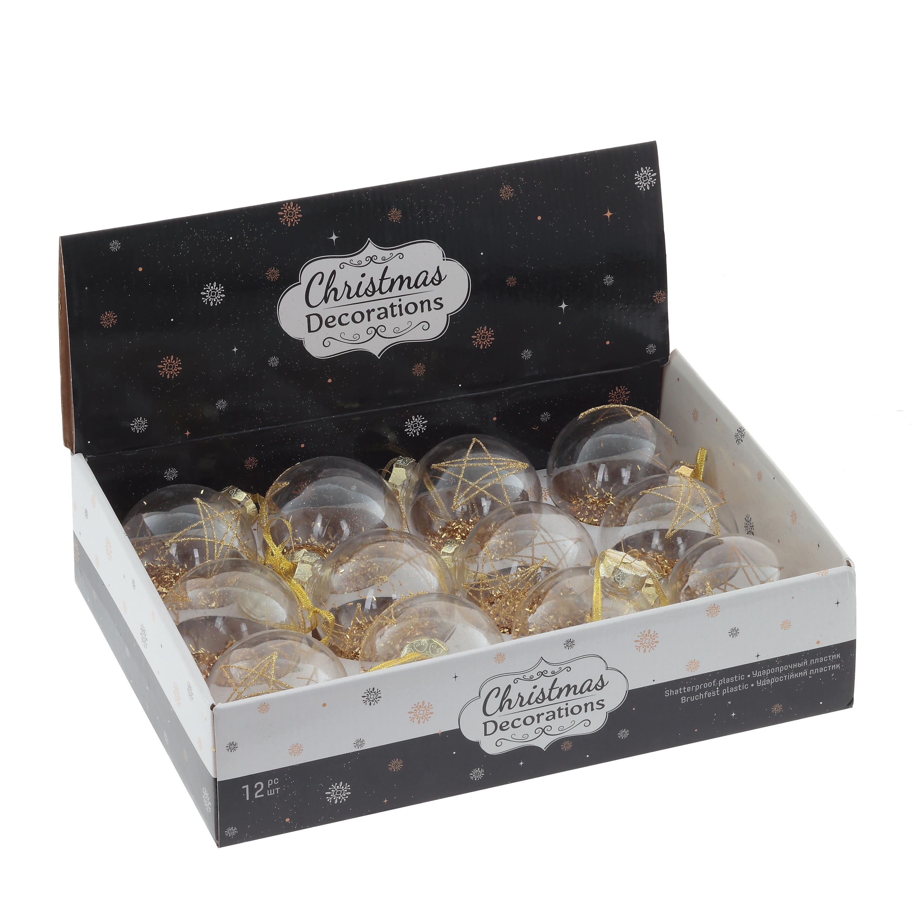 Набор шаров для елки в шоу-боксе. Эти прозрачные новогодние шары с узором в виде звезды и золотым глиттером внутри непременно порадуют вас своим изяществом и прекрасно дополнят праздничный наряд лесной красавицы.