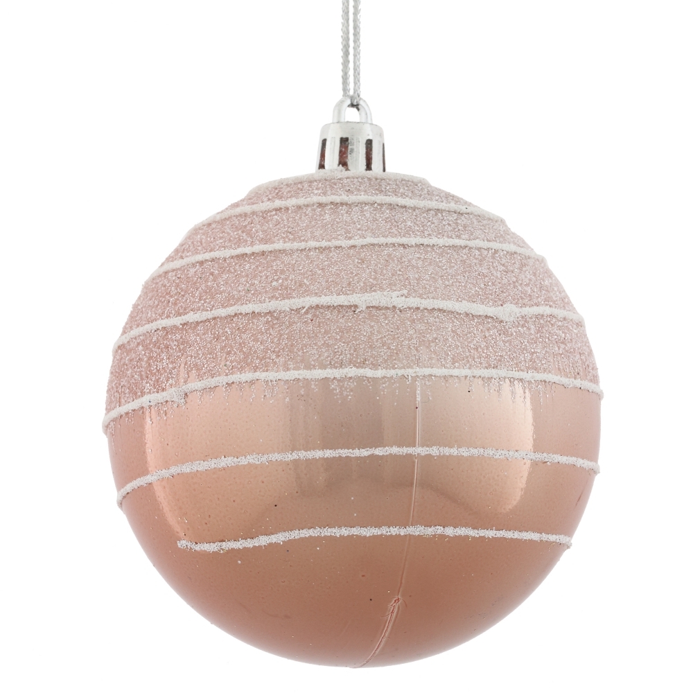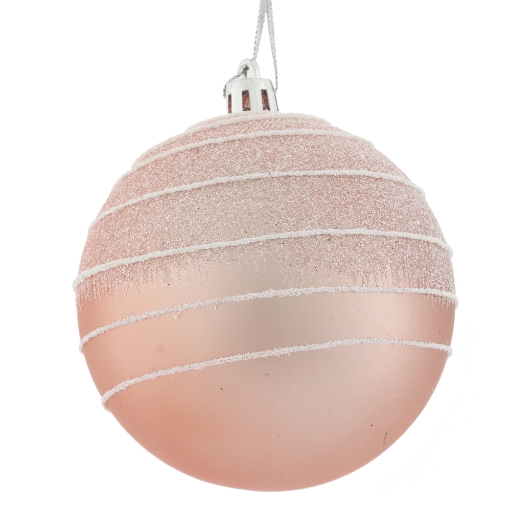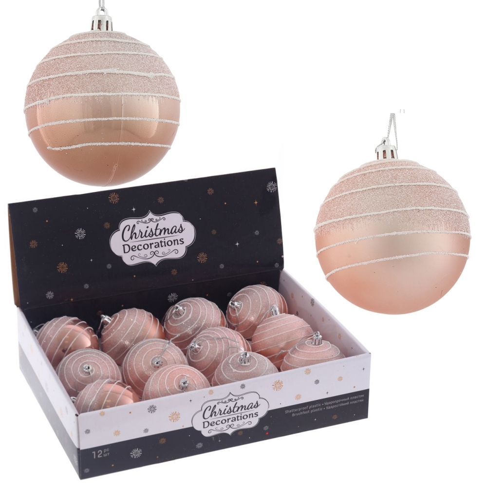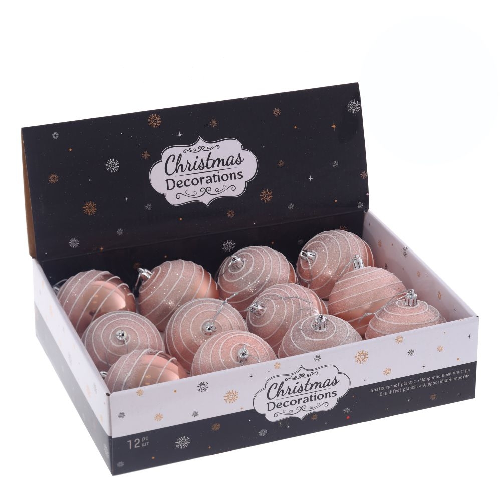 Набор из 12-ти шаров для елки в шоу-боксе. Эти розовые с тонким узором новогодние шары из пластика, непременно порадуют вас своим изяществом и прекрасно дополнят праздничный наряд лесной красавицы.