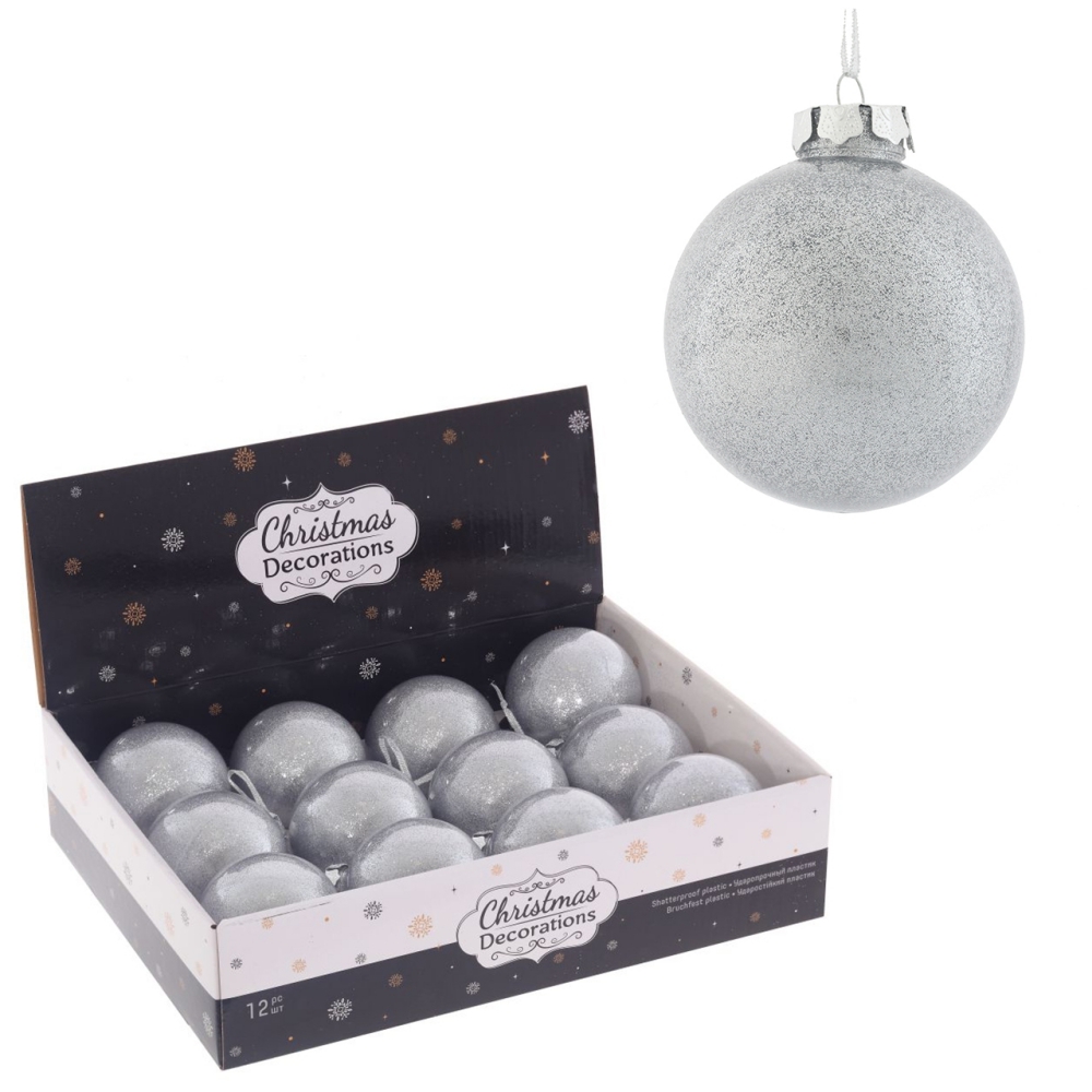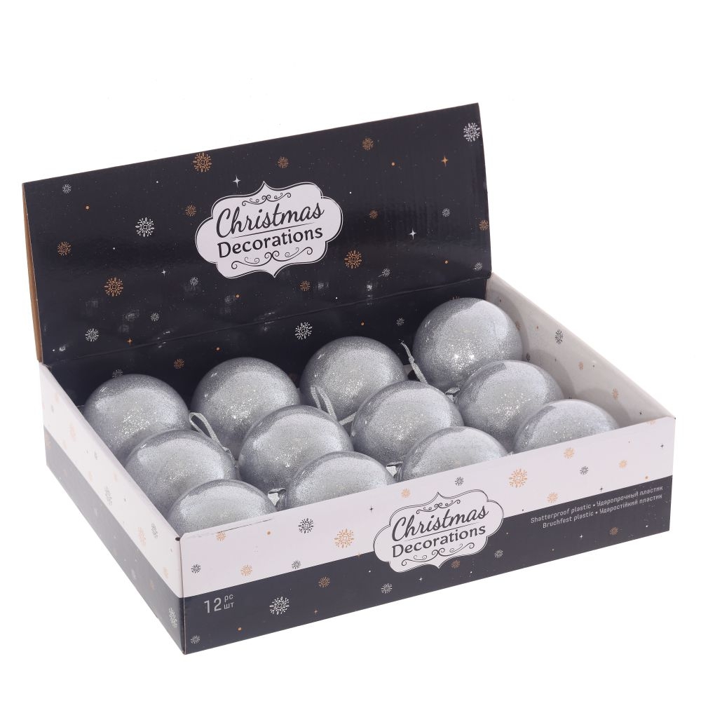 Набор из 12-ти шаров для елки в шоу-боксе. Эти новогодние шары серебряного цвета, непременно порадуют вас своим изяществом и прекрасно дополнят праздничный наряд лесной красавицы.