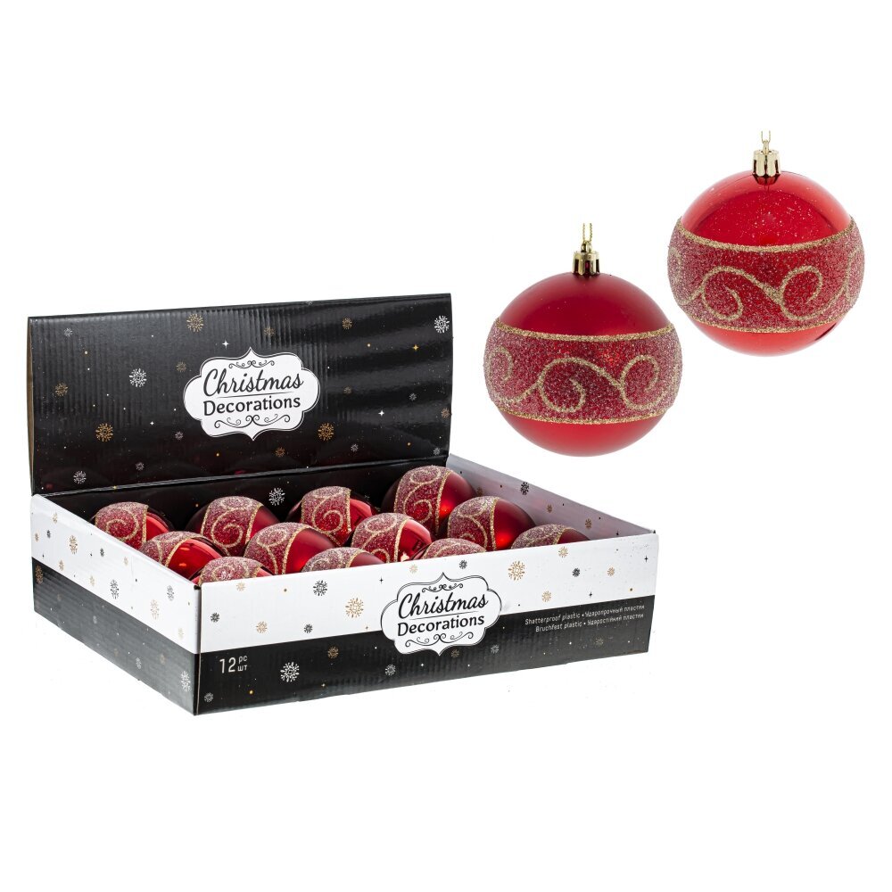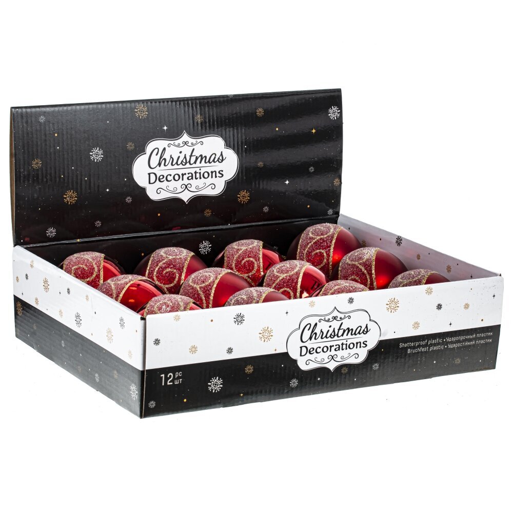 Набор из 12-ти шаров для елки в шоу-боксе. Эти новогодние шары из пластика, непременно, порадуют вас своим изяществом и прекрасно дополнят праздничный наряд лесной красавицы.