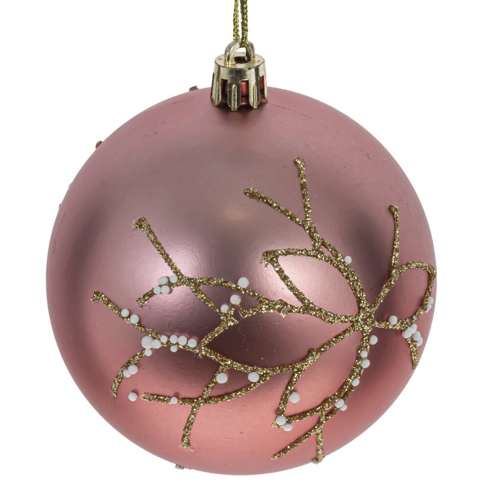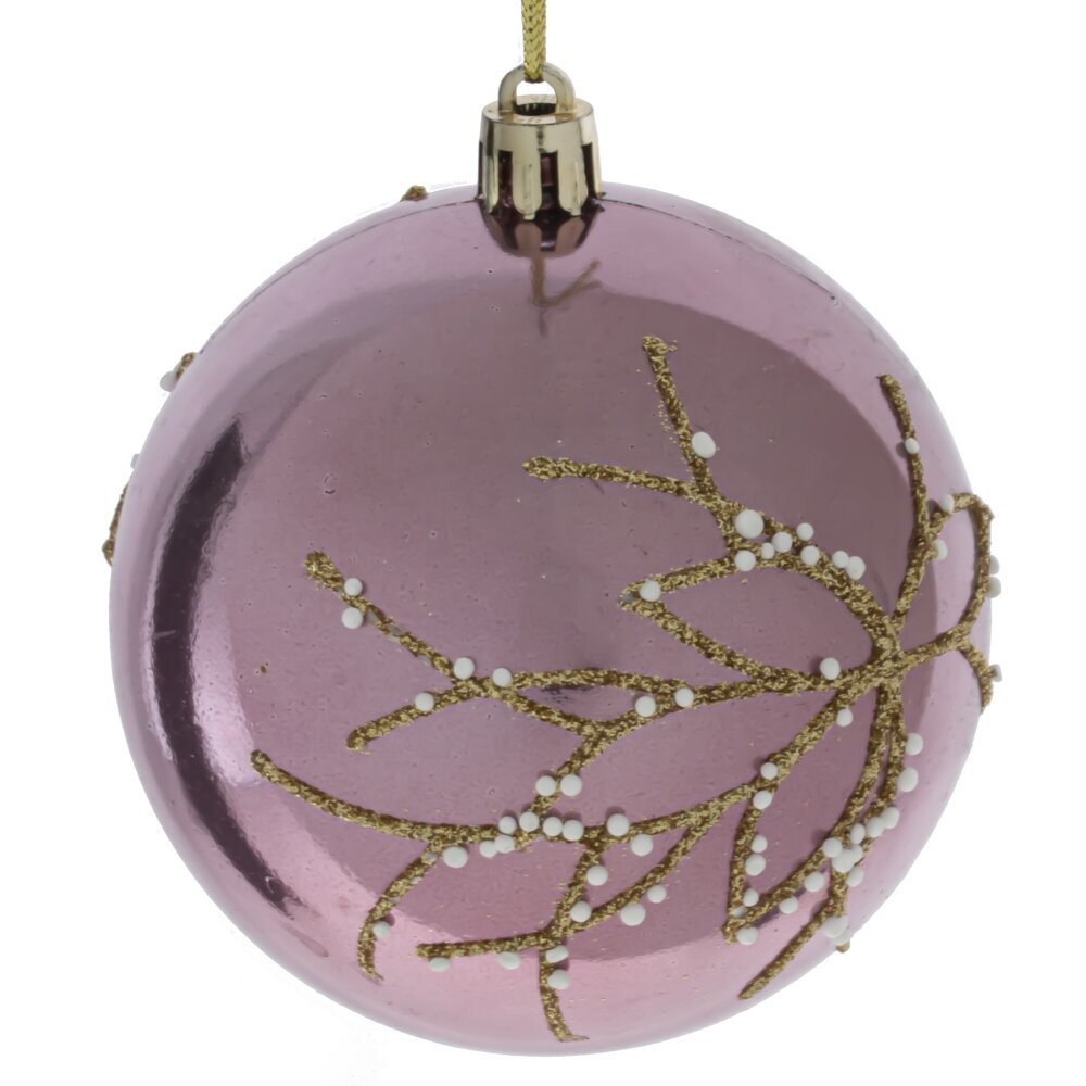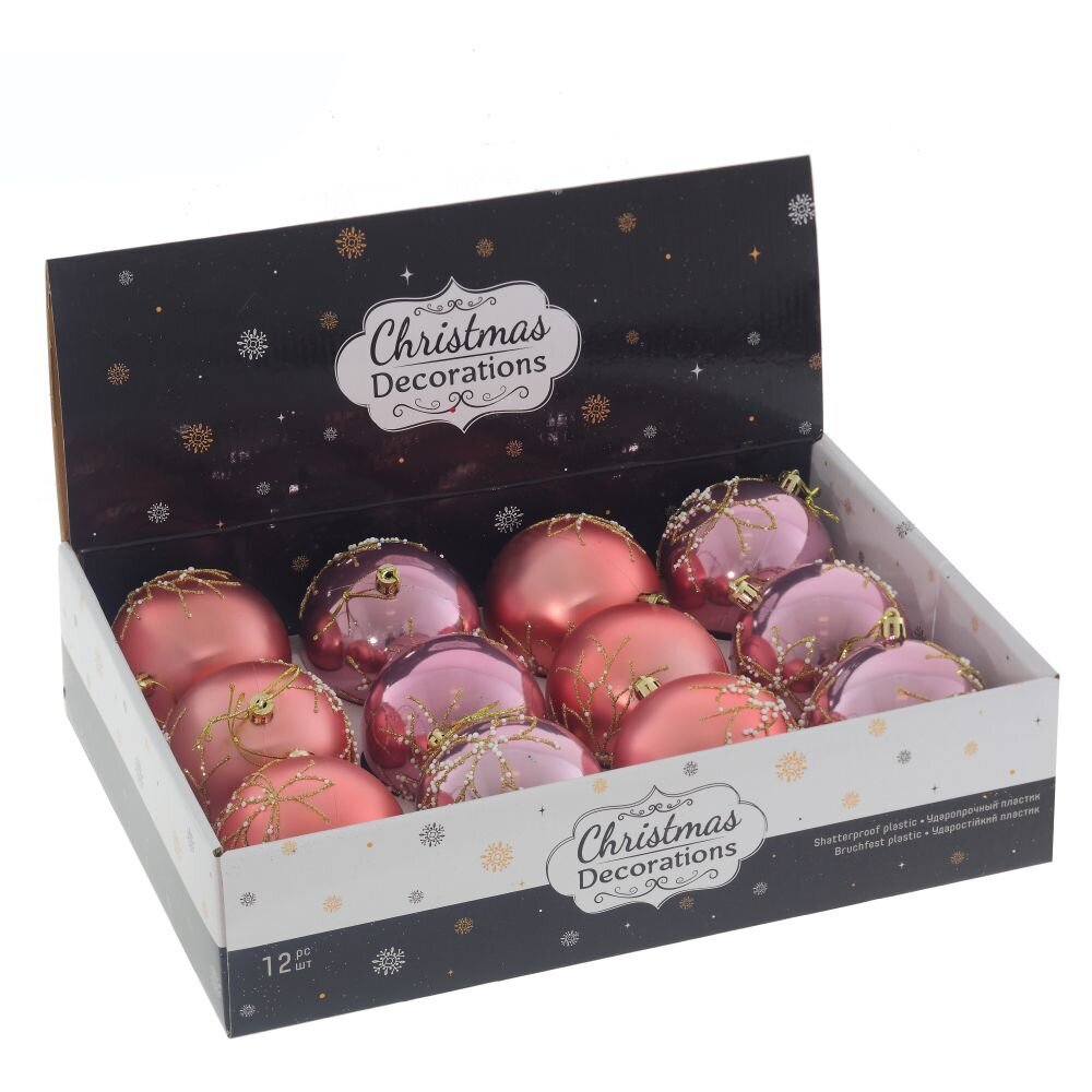 Набор из 12-ти шаров для елки в шоу-боксе. Эти розовые и фиолетовые, с тонким узором новогодние шары из пластика, непременно порадуют вас своим изяществом и прекрасно дополнят праздничный наряд лесной красавицы.