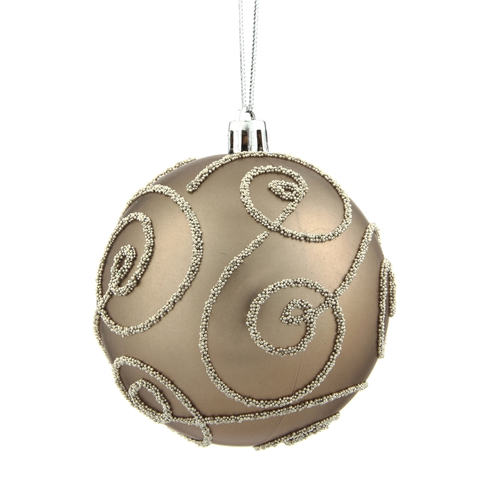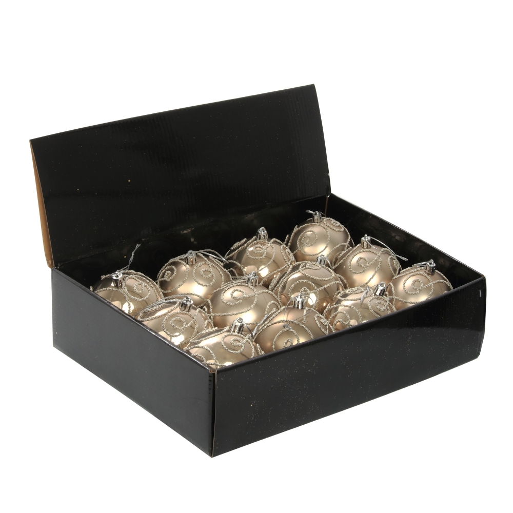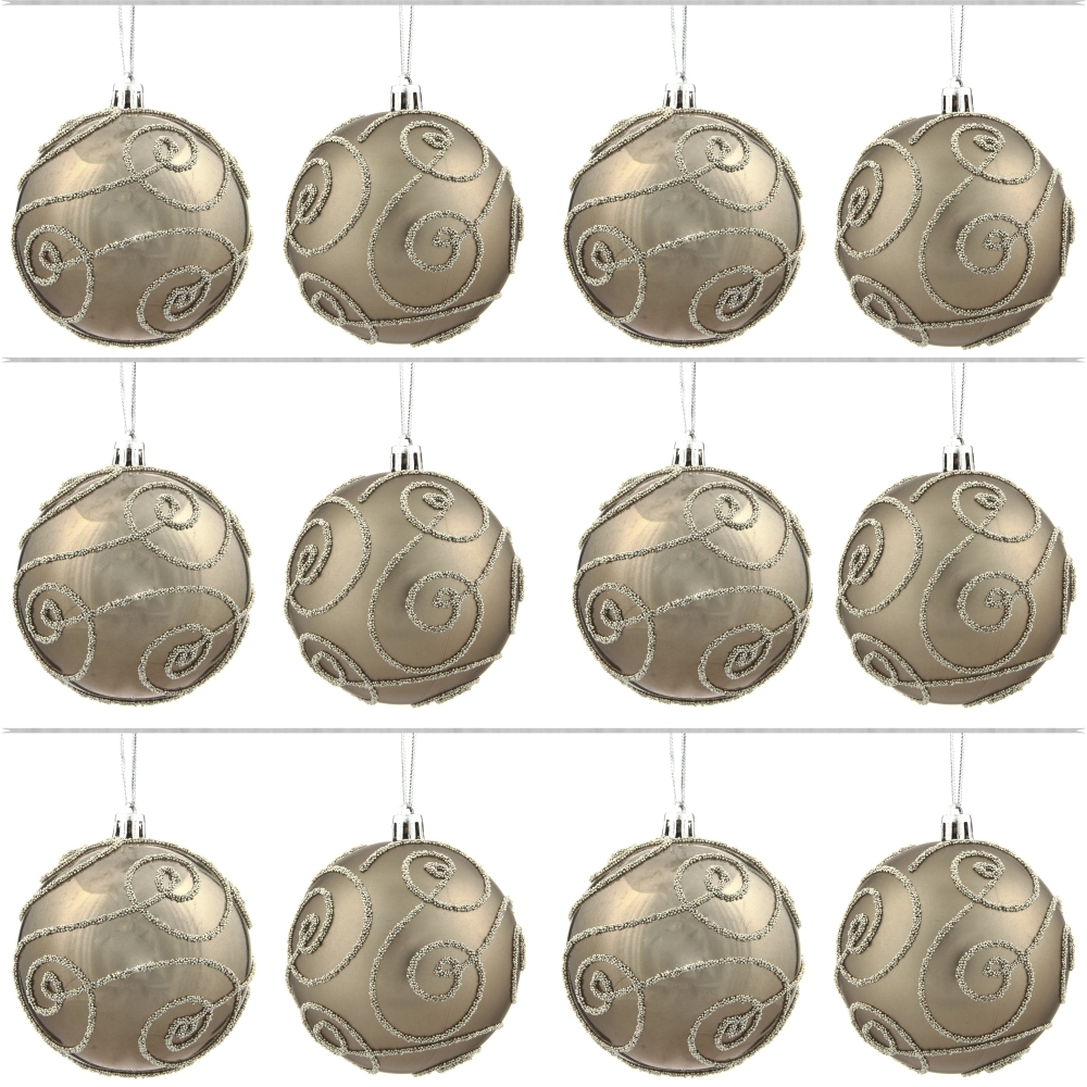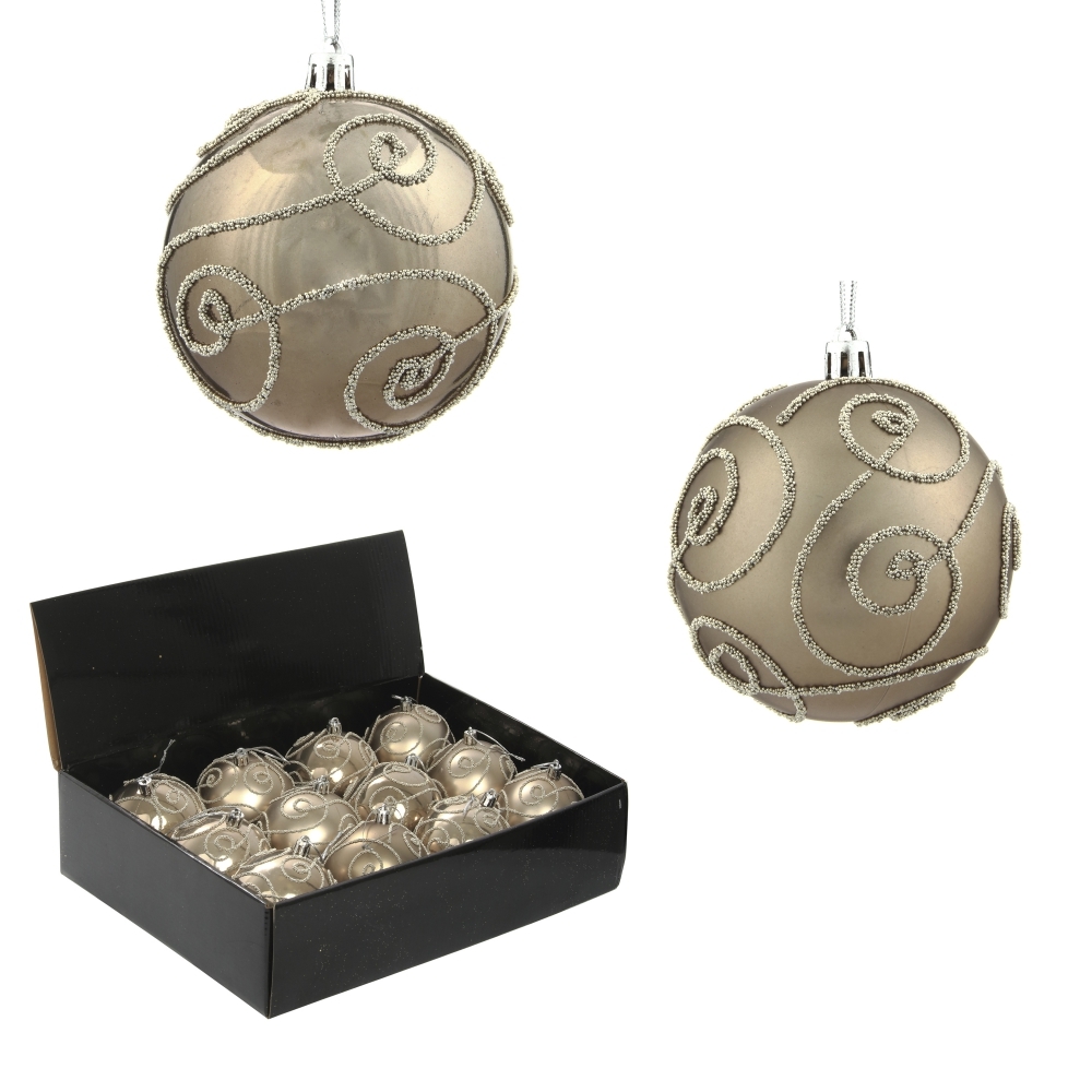 Набор из 12-ти новогодних украшений (красивые елочные шары с серебристыми завитками) изготовлен из полимерных материалов, в подарочной упаковке