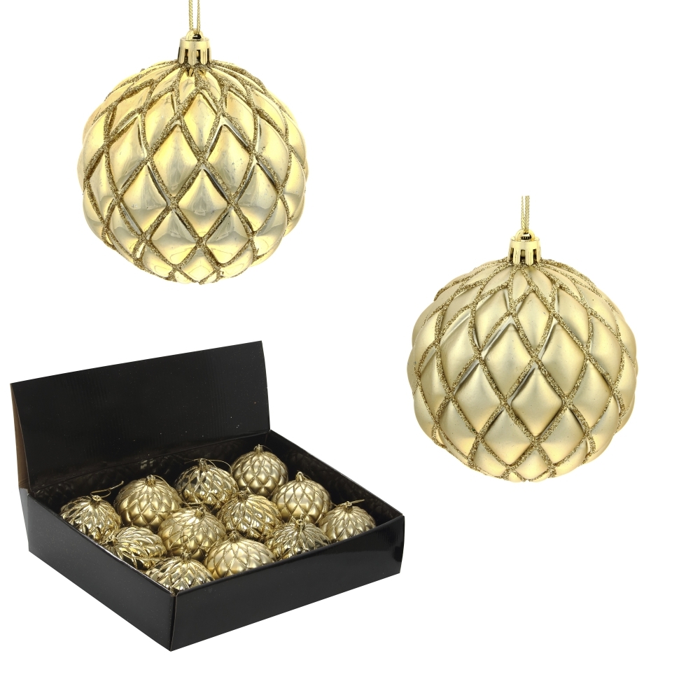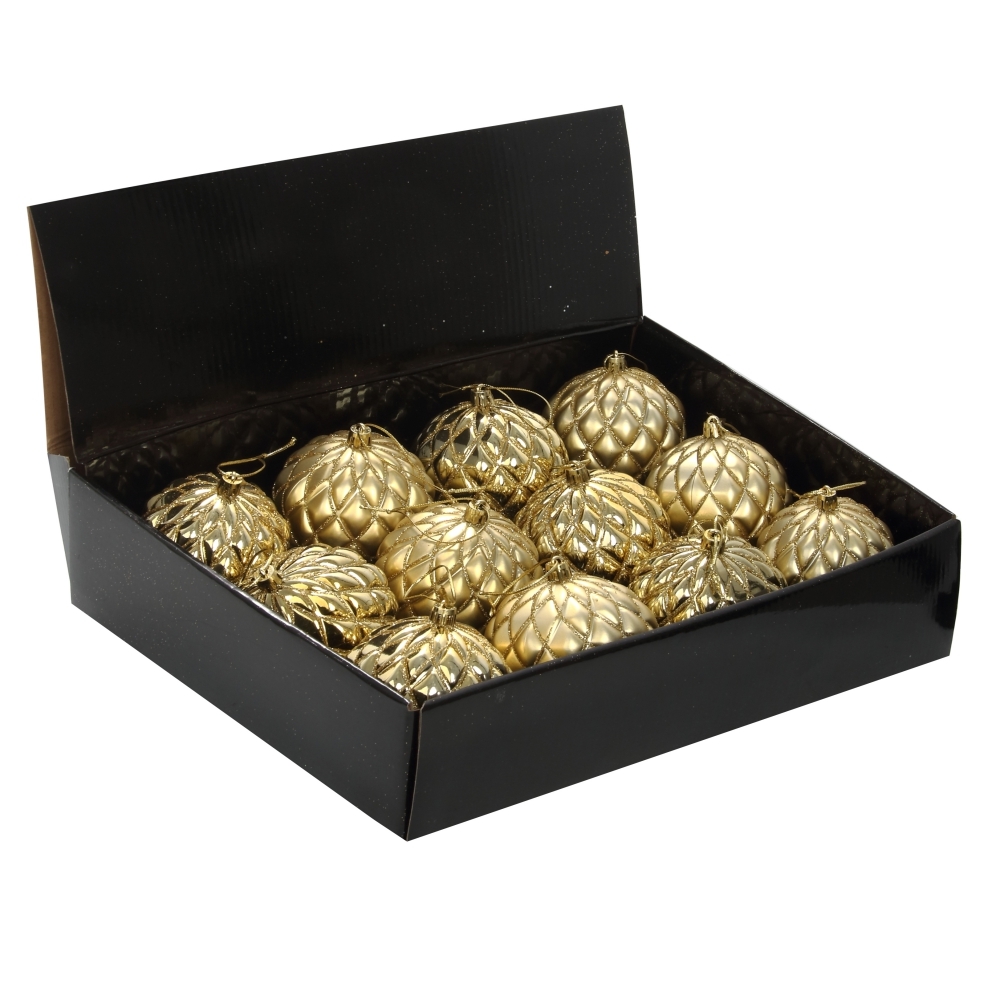 Набор из 12-ти шаров для елки в шоу-боксе. Эти новогодние шары из пластика, непременно порадуют вас своим изяществом и прекрасно дополнят праздничный наряд лесной красавицы.