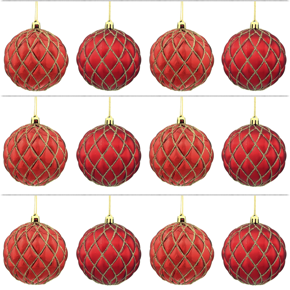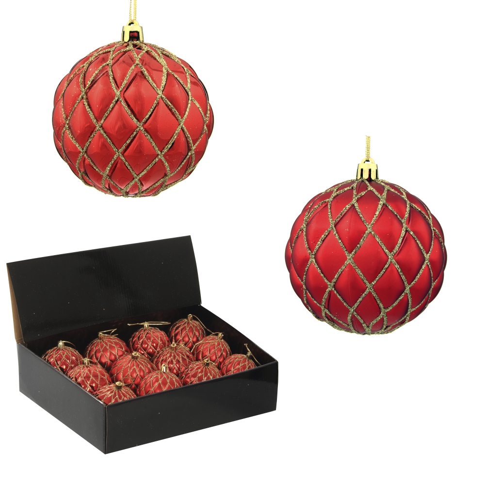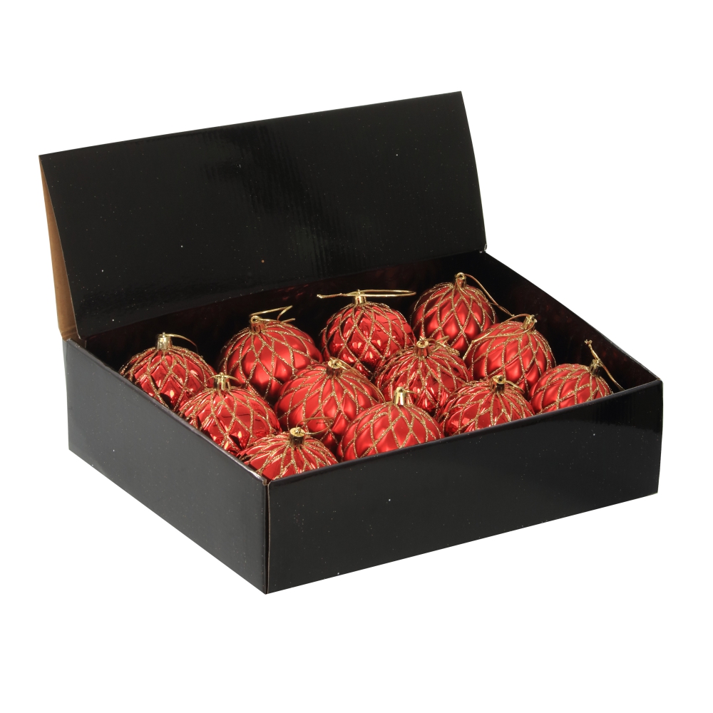 Набор из 12-ти шаров для елки в шоу-боксе. Эти новогодние шары из пластика, непременно порадуют вас своим изяществом и прекрасно дополнят праздничный наряд лесной красавицы.
