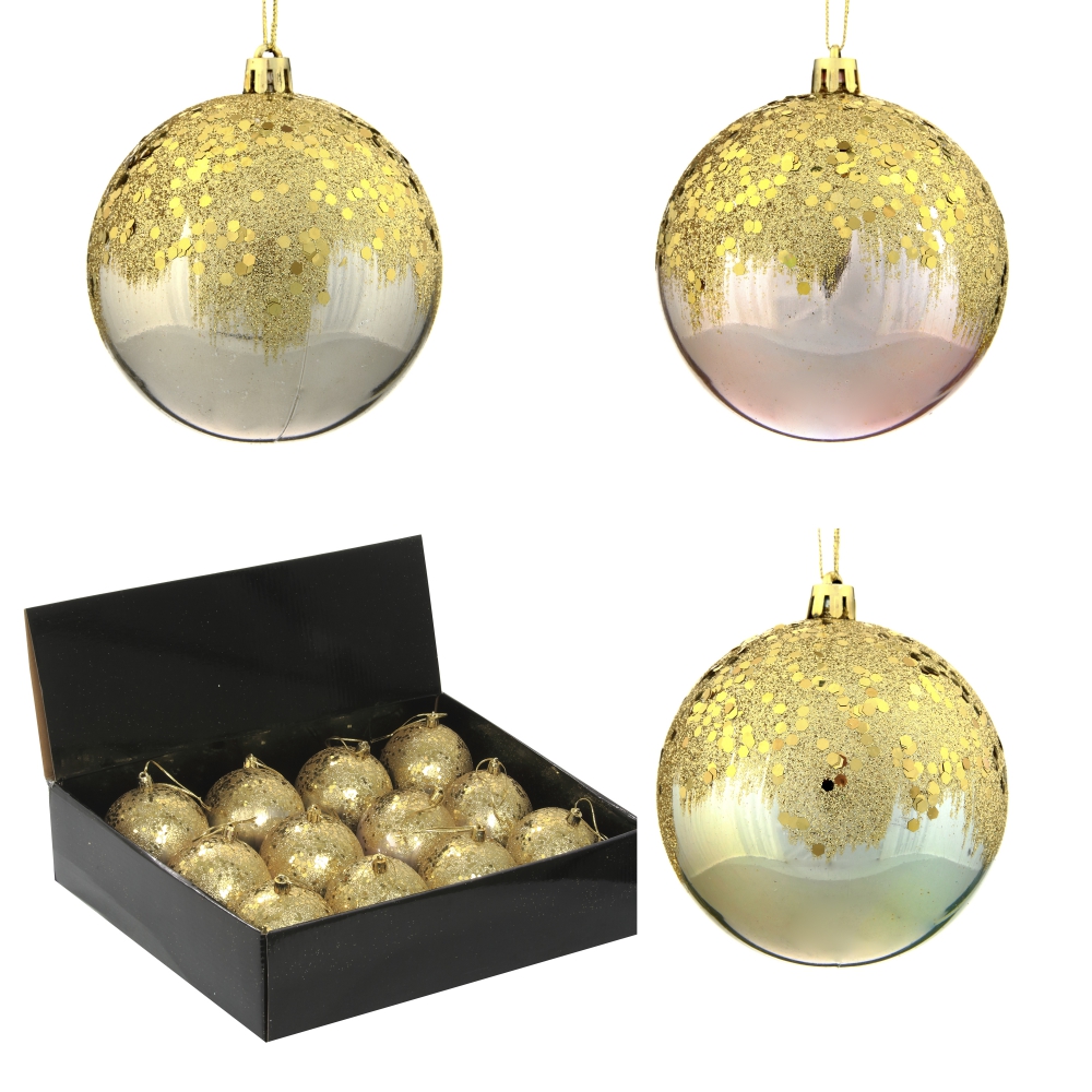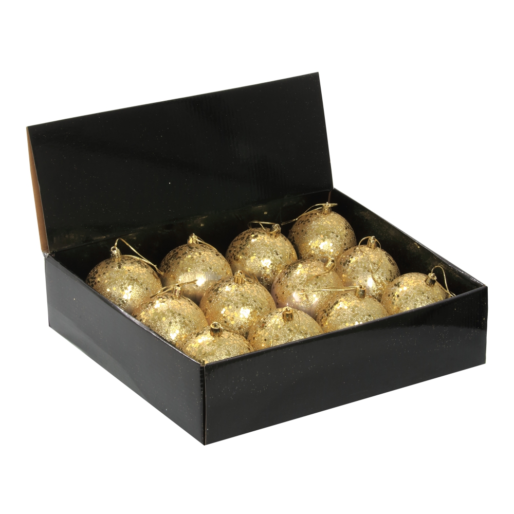 Набор из 12-ти шаров для елки в шоу-боксе. Эти новогодние шары из пластика, непременно порадуют вас своим изяществом и прекрасно дополнят праздничный наряд лесной красавицы.