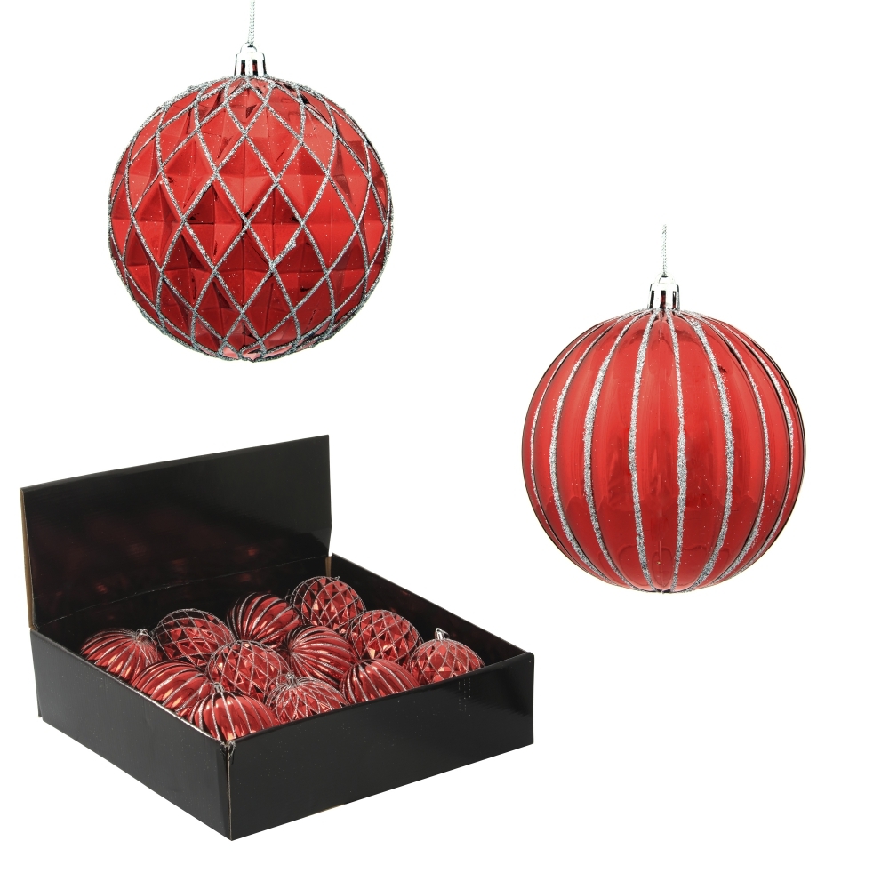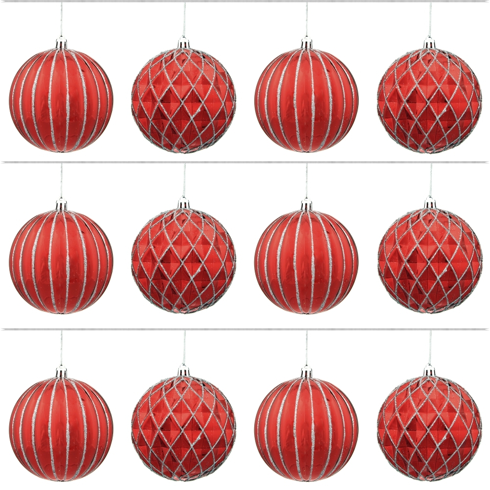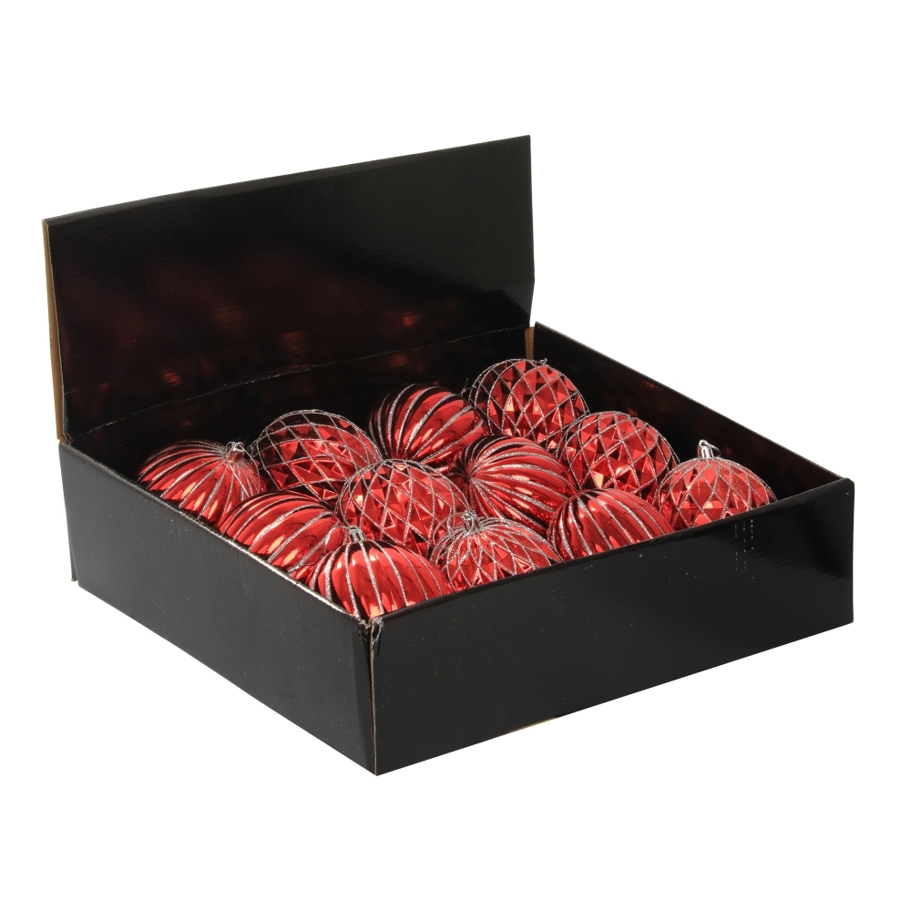 Набор из 12-ти шаров для елки в шоу-боксе. Эти новогодние шары из пластика, непременно порадуют вас своим изяществом и прекрасно дополнят праздничный наряд лесной красавицы.