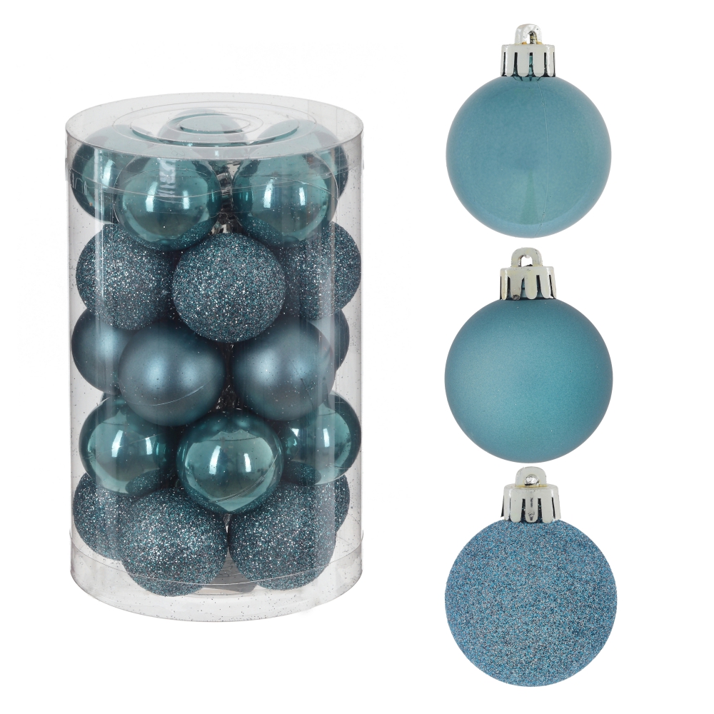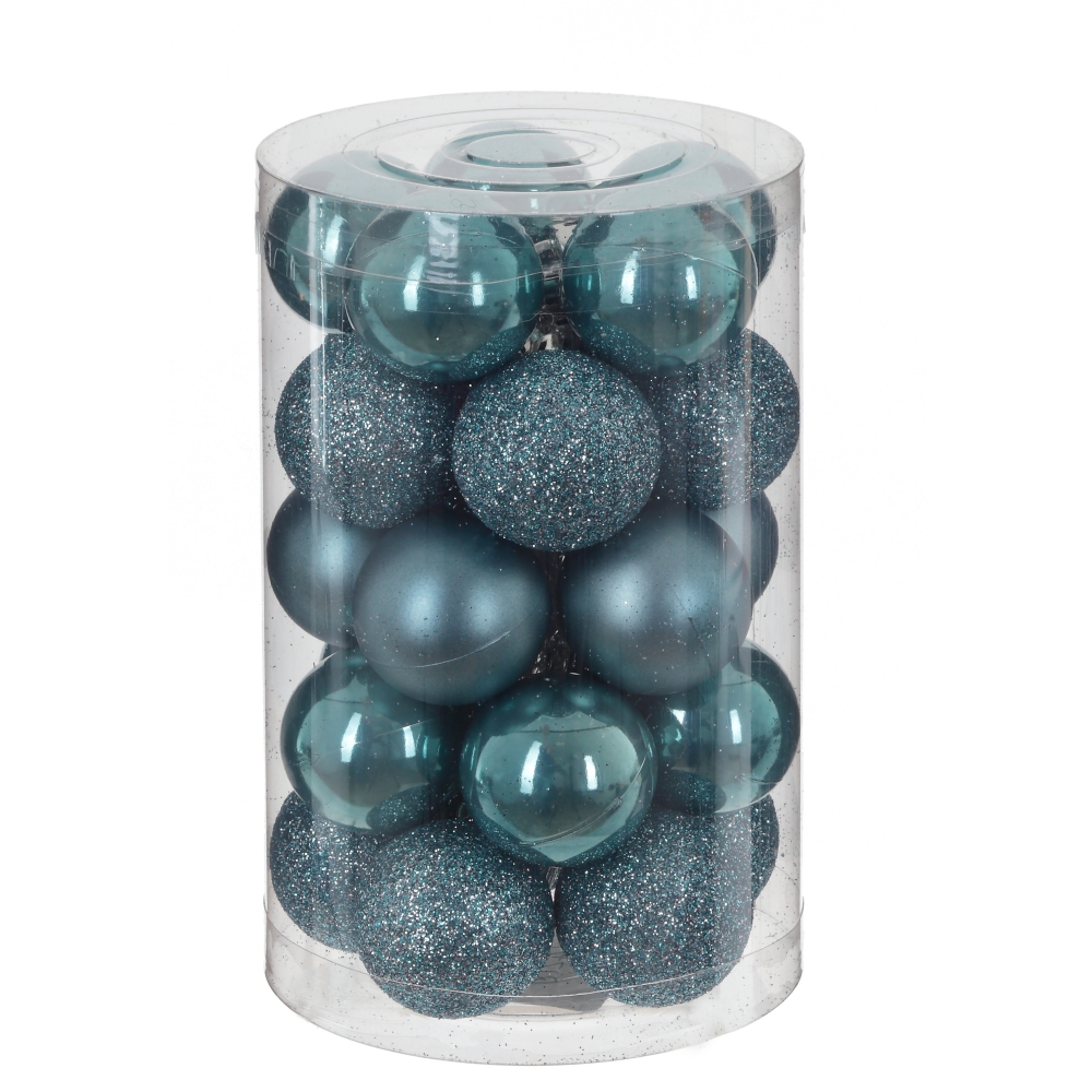 Набор из 25-ти елочных шаров выполнен в единой цветовой гамме. В составе набора - пластиковые шары разной фактуры - глянцевые, матовые и с глиттером. Прекрасно смотрятся в убранстве новогодней ели. Поставляются в прозрачном пластиковом контейнере.