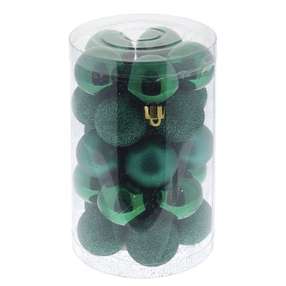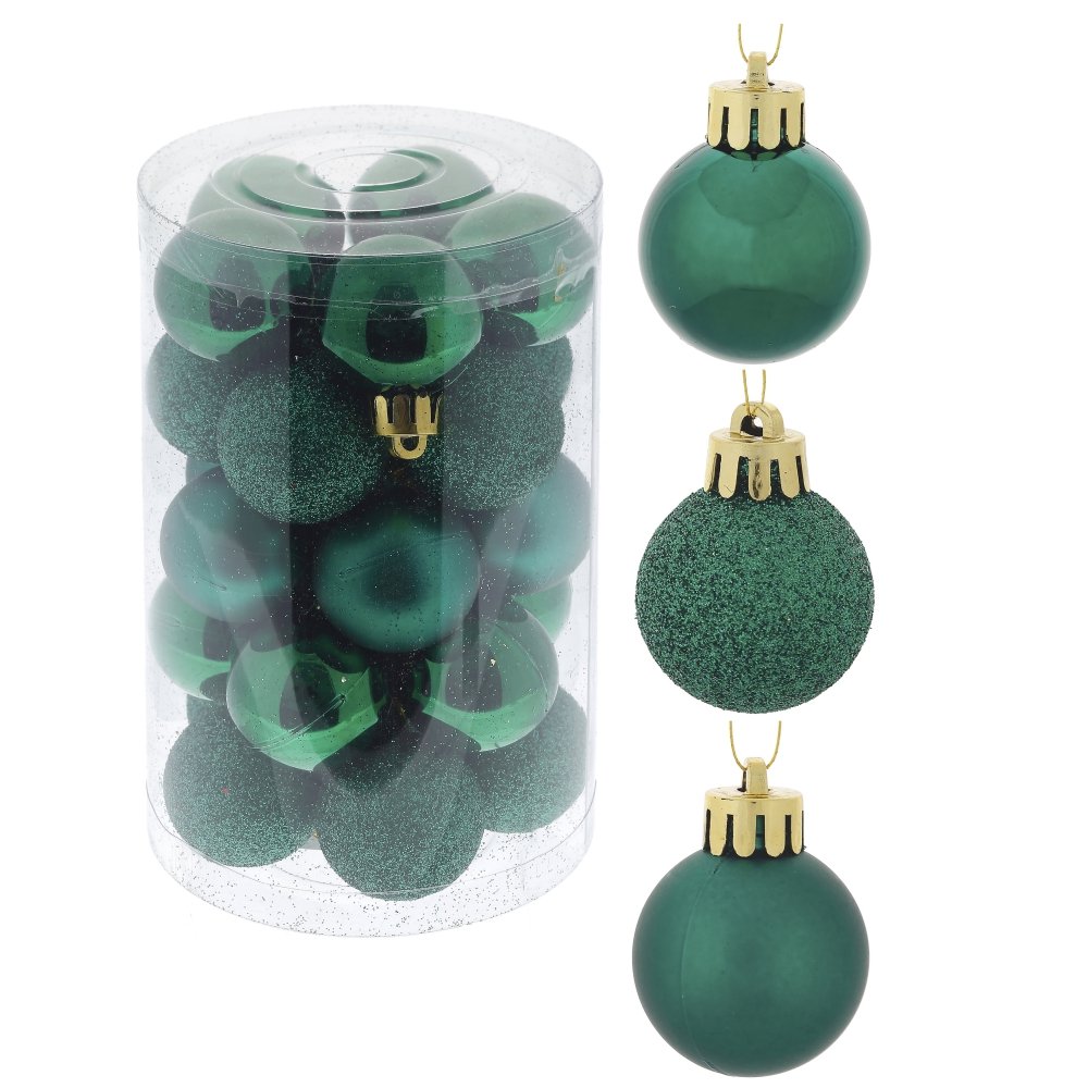 Набор из 25-ти елочных шаров, диаметром 3 см, выполнен в единой цветовой гамме. В составе набора - пластиковые шары разной фактуры - глянцевые, матовые и с глиттером. Прекрасно смотрятся в убранстве новогодней ели. Поставляются в прозрачной пластиковой упаковке.