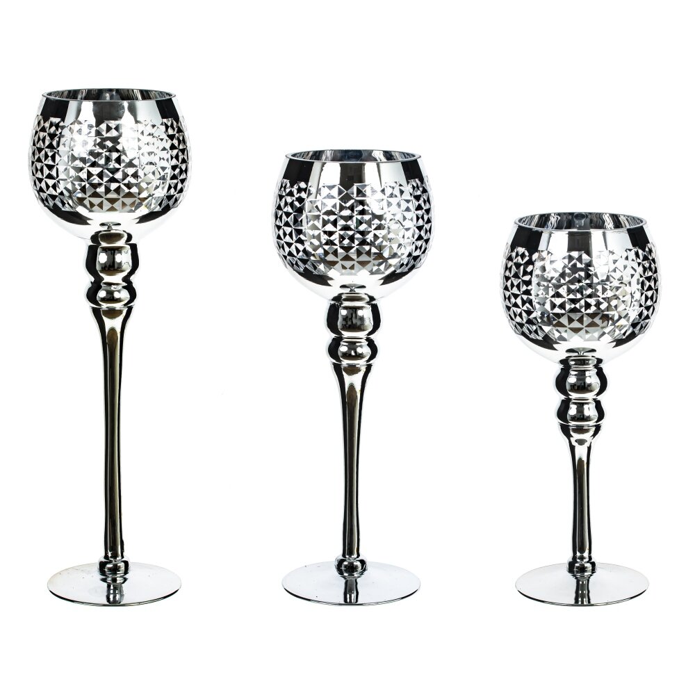 Набор из трех оригинальных стеклянных подсвечников на высоких ножках - прекрасный аксессуар для оформления праздничного стола. Он дополнит сервировку стола, подойдет для романтического вечера, или, просто украсит ваш дом. Размеры подсвечников: 12*12*40/35/30 см. Для свечи диаметром до 7 см.
