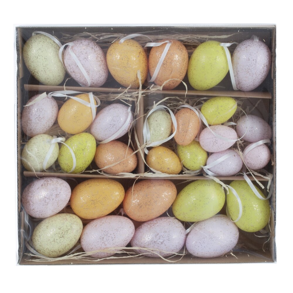 Набор из 30 декоративных подвесных яиц — идеальное украшение для пасхального декора. Изделия выполнены из прочного полимерного материала и окрашены в нежные пастельные оттенки: розовый, жёлтый, оранжевый и светло-зелёный. Поверхность украшена мелкими вкраплениями, создающими стильный и естественный эффект. Каждое яйцо оснащено белой лентой для удобного подвешивания. Такой набор отлично подойдёт для декорации пасхального дерева, праздничного стола, венков или интерьерных композиций. Лёгкие и практичные, эти яйца можно использовать многократно, создавая уютную атмосферу на каждый Пасхальный праздник.