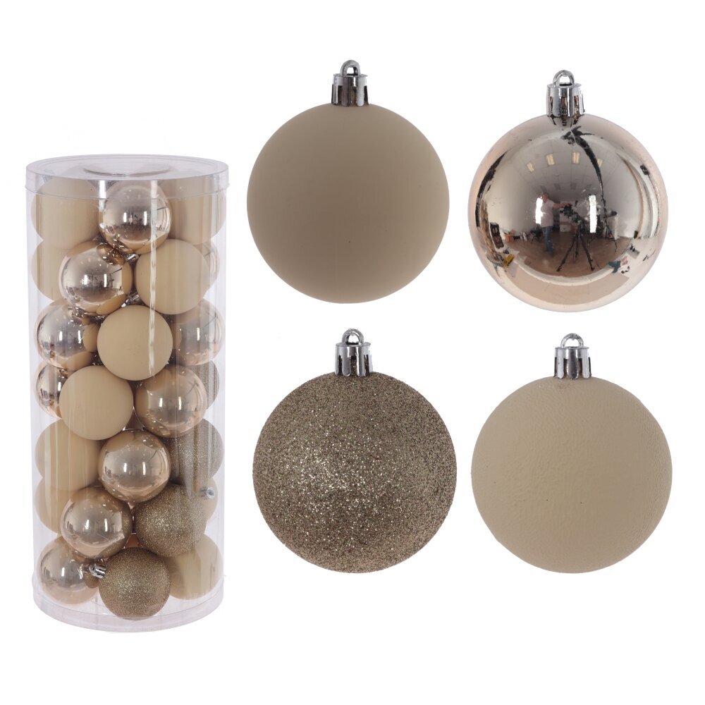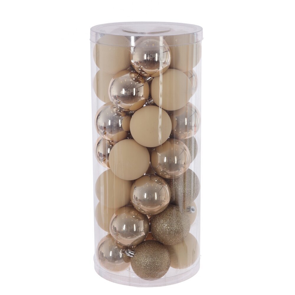 Набор новогодних украшений "Шар" включает 35 шаров диаметром 6 см в единой цветовой гамме. Эти изысканные шары разделены на 4 вида разных фактур-глянцевые, матовые и декорированные шиммером. Они прекрасно сочетаются между собой, создавая волшебную атмосферу и олицетворяя красоту новогодних праздников.