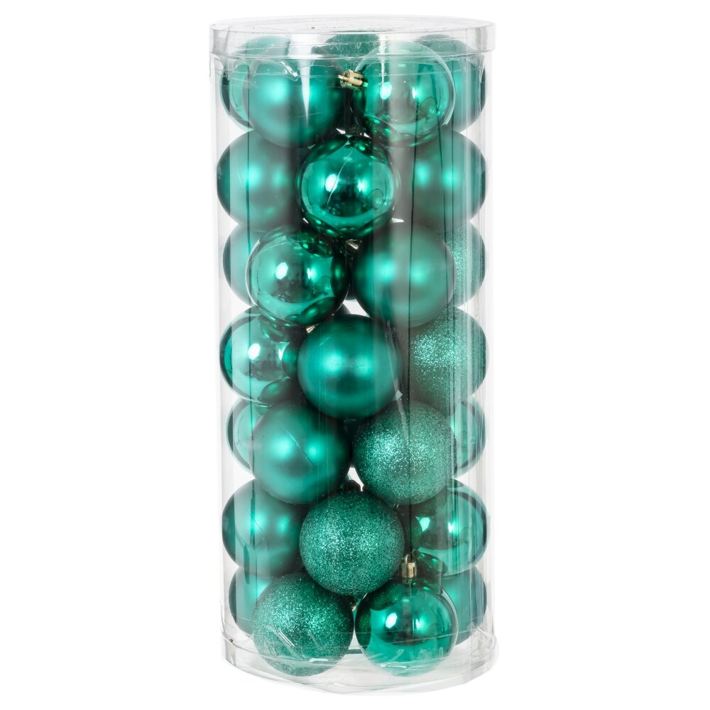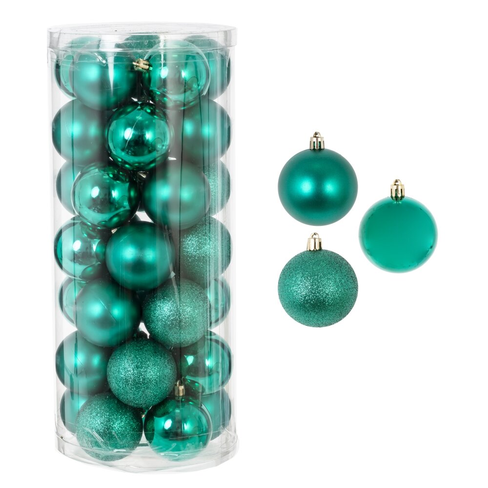 Набор из 35-ти елочных шаров, диаметром 6 см, выполнен в единой цветовой гамме. В составе набора - пластиковые шары разной фактуры - глянцевые, матовые и с глиттером. Прекрасно смотрятся в убранстве новогодней ели. Поставляются в прозрачной пластиковой упаковке.