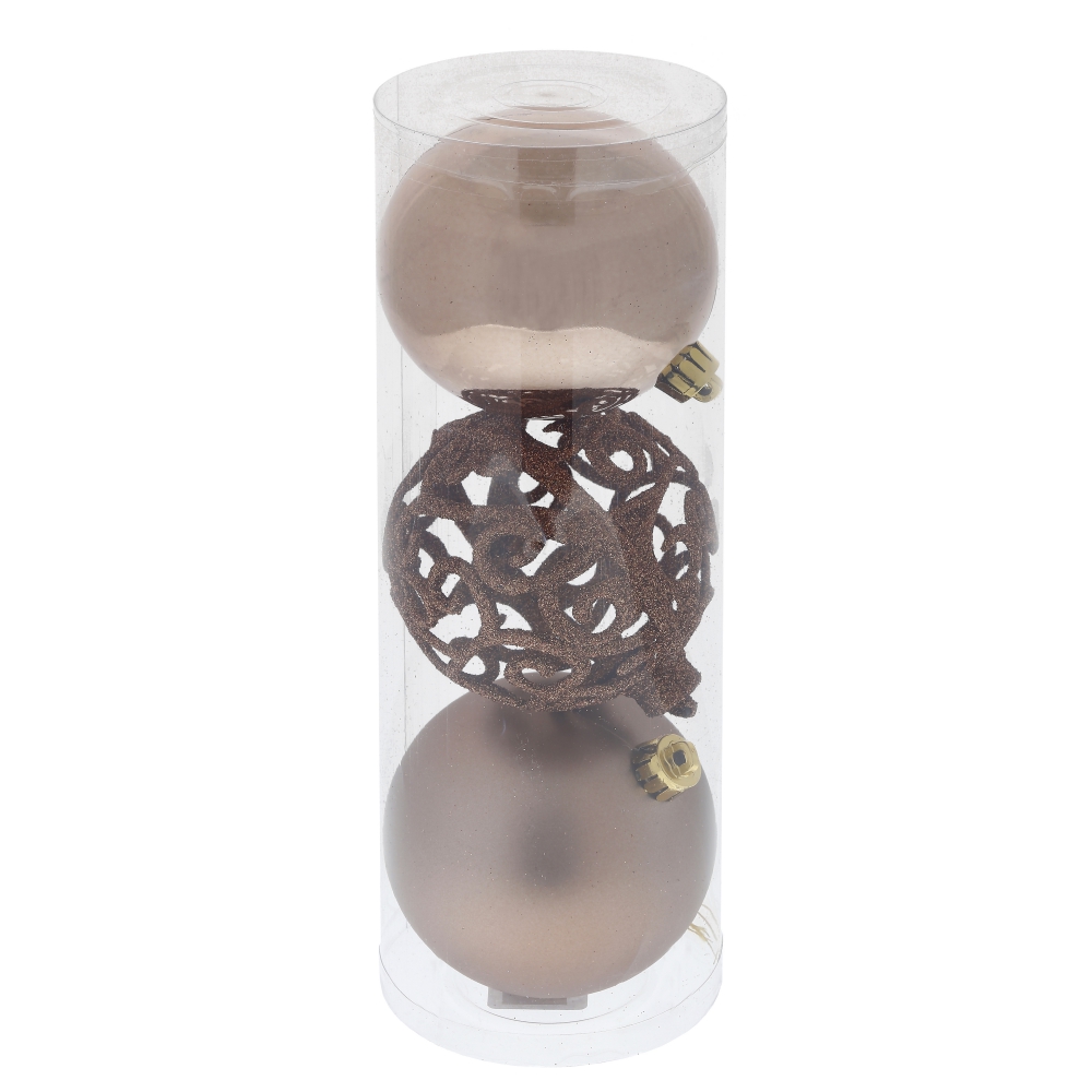 Набор из 3-х елочных шаров, диаметром 8 см, выполнен в единой цветовой гамме. В составе набора - пластиковые шары разной фактуры - глянцевые, матовые и с глиттером ажурные. Прекрасно смотрятся в убранстве новогодней ели. Поставлются в прозрачной пластиковой упаковке.