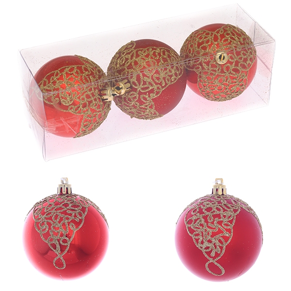 Набор из 3-х новогодних украшений (матовые и глянцевые елочные шары с золотым узором) изготовлен из полимерных материалов, в подарочной упаковке