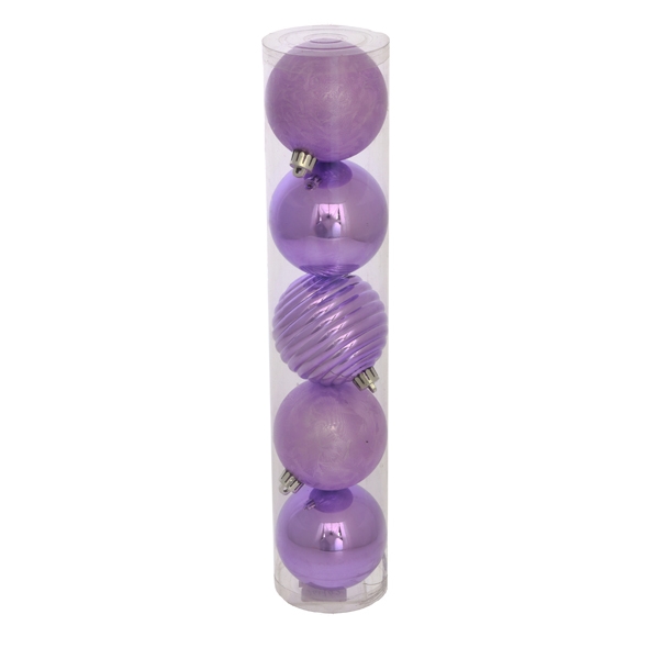Набор из 5-ти новогодних украшений (глянцевые и матовые фиолетовые елочные шары) изготовлен из полимерных материалов, в подарочной упаковке