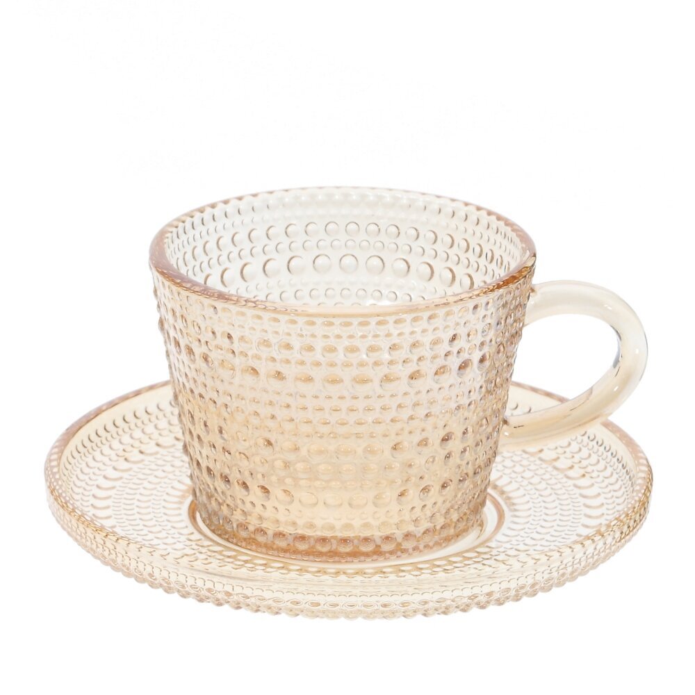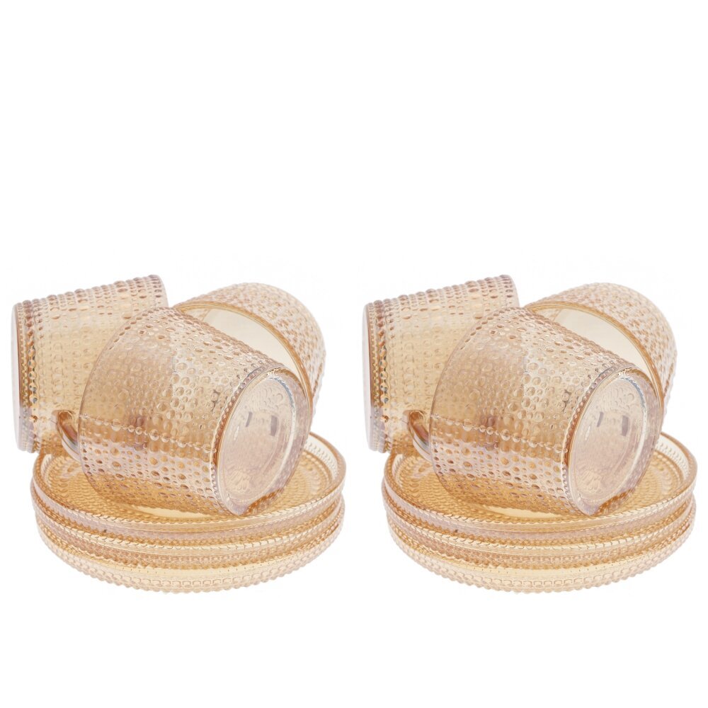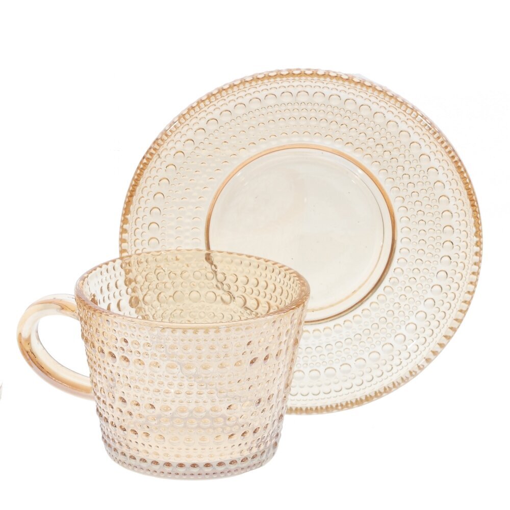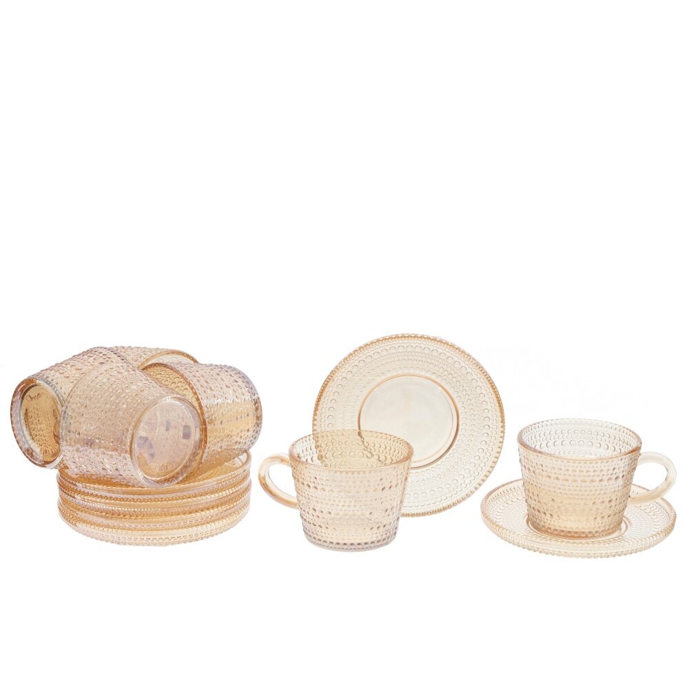 Элегантный набор из 6 чашек с блюдцами из прозрачного стекла теплого янтарного оттенка. Каждая чашка объемом 155 мл оснащена удобной ручкой и украшена рельефным узором из мелких выпуклых точек, которые красиво играют на свету. Блюдца повторяют текстуру, создавая гармоничную пару для сервировки чая, кофе или травяных настоев. Стекло подчеркивает цвет напитка и легко сочетается с другой посудой, а винтажный характер декора добавляет уют и стиль на каждый день и к праздничному столу. Отличный подарок для ценителей изящной сервировки.