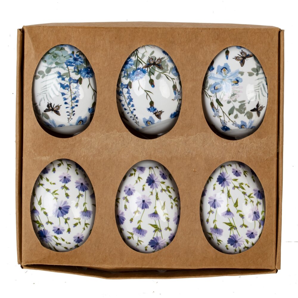 Этот декоративный набор из 6 подвесных яиц станет прекрасным украшением для интерьера, особенно в преддверии Пасхи. Изделия выполнены из полимерных материалов, что делает их легкими, прочными и долговечными. Каждое яйцо украшено изысканным цветочным орнаментом в нежных голубых и фиолетовых тонах, добавляя весеннего настроения в декор. Элементы дизайна включают изящные цветы и веточки, а также изображение бабочек, создавая ощущение легкости и природы. Эти украшения подойдут для оформления праздничного стола, пасхального дерева или других декоративных композиций. Благодаря подвесному механизму яйца можно легко разместить в интерьере.