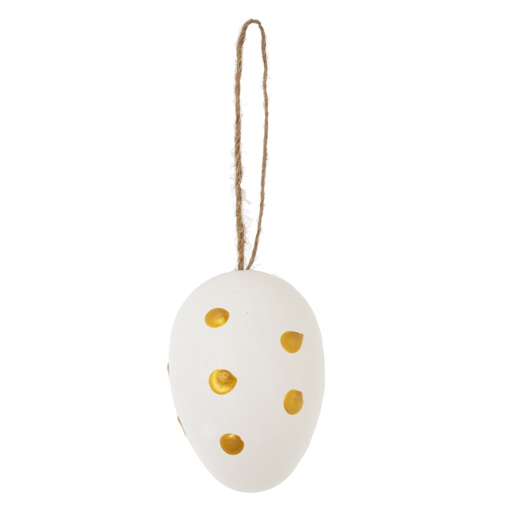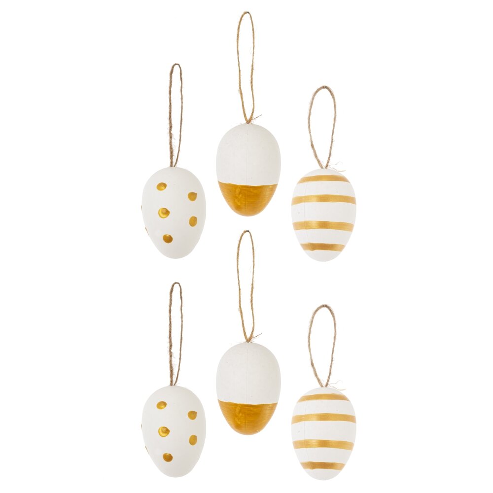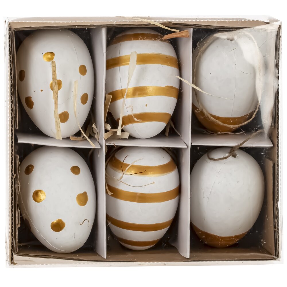 Набор декоративных подвесных украшений «Яйцо пасхальное» из 6 изделий — стильное решение для оформления дома к светлому празднику Пасхи. Лёгкие яйца из полимерных материалов окрашены в белый цвет с золотыми акцентами: полосы, горошек и половинное покрытие создают гармоничную композицию. Каждое яйцо снабжено петелькой из натурального шнура, благодаря чему украшения удобно развешивать на пасхальном дереве, веточках, дверных ручках, в композициях и венках. Набор подойдёт для оформления интерьера, праздничного стола, фотозоны, а также станет приятным небольшим подарком для родных и друзей.