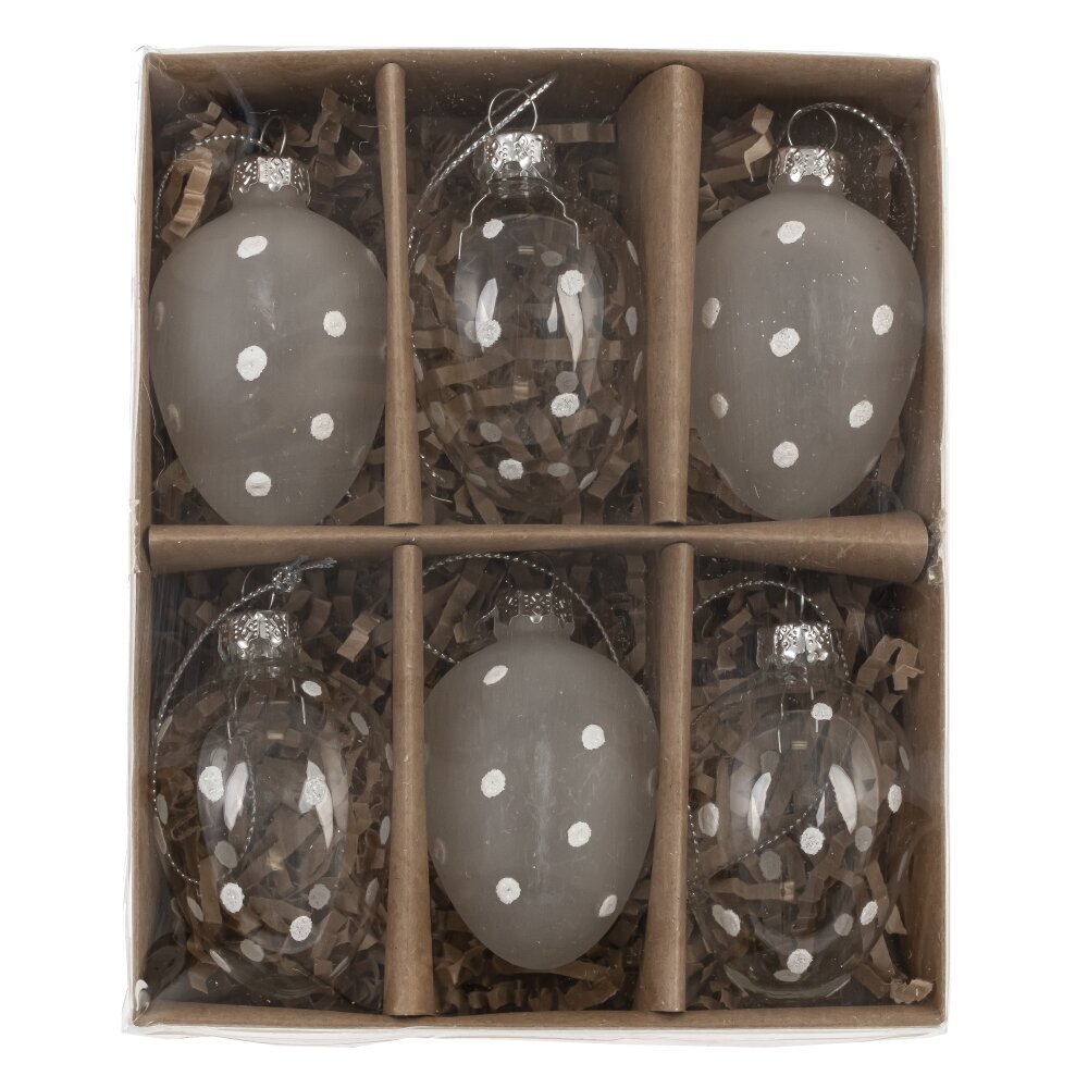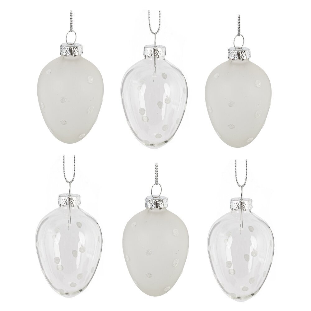 Этот набор из шести декоративных подвесных изделий «Яйцо пасхальное» подойдет для создания стильного и праздничного декора. Каждое яйцо изготовлено из стекла, имеет размеры 4*6 см и украшено изящными точечными узорами. В комплект входят как матовые, так и прозрачные яйца, что позволяет создать интересные композиции. Подвесные элементы оснащены удобными петельками, благодаря которым их легко разместить на ветках, венках или в интерьере. Этот набор станет отличным украшением для дома, подарком на Пасху или элегантным дополнением праздничного декора.