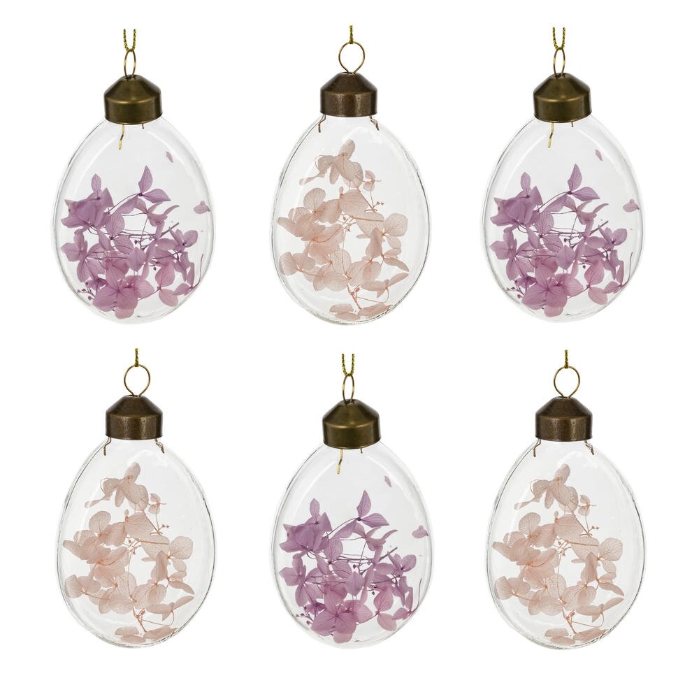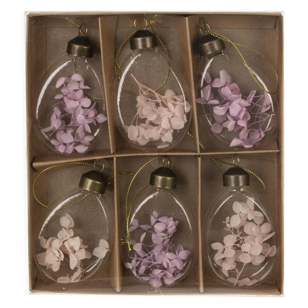 Набор из 6-ти декоративных подвесных изделий «Яйцо пасхальное» – изящное украшение для создания весеннего настроения в доме. Прозрачные стеклянные яйца наполнены тонкими сухоцветами нежных розовых и сиреневых оттенков, которые выглядят будто парящие внутри. Каждое яйцо оснащено металлической верхушкой в винтажном стиле и золотистым шнурком для подвешивания. Такие подвески идеально подойдут для оформления пасхального дерева, композиции на окне, каминной полки или праздничного стола. Стекло визуально лёгкое, не утяжеляет интерьер и гармонично сочетается с любым декором. Набор можно использовать многократно из года в год, а также дарить как стильный сезонный сувенир к Пасхе.