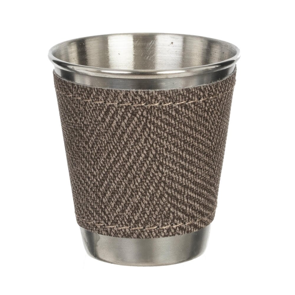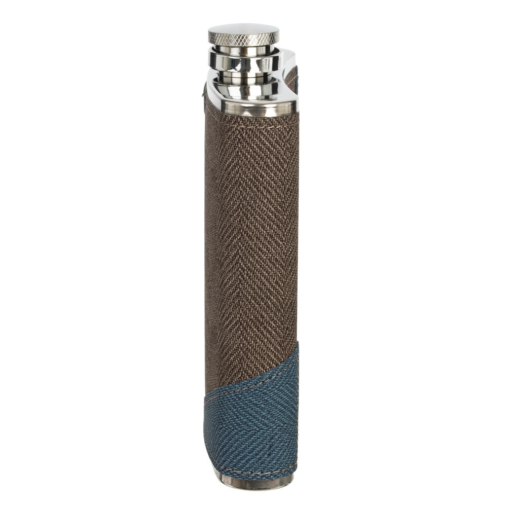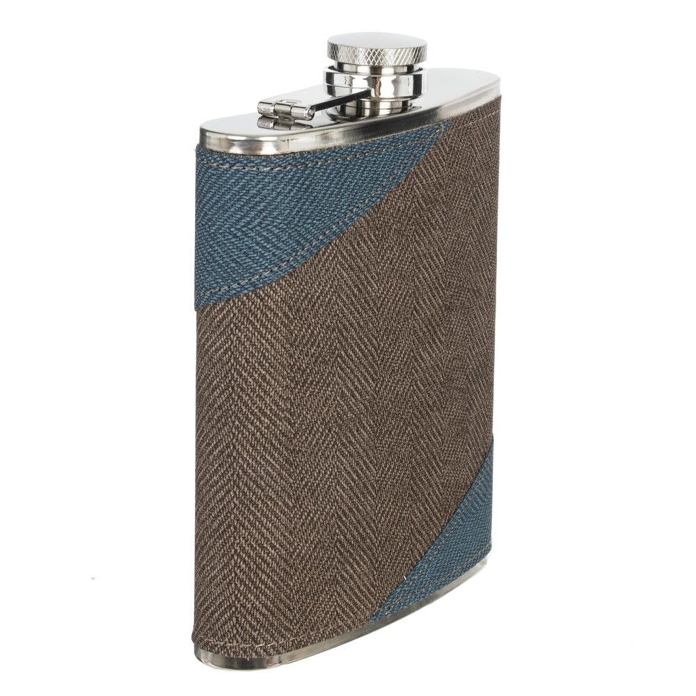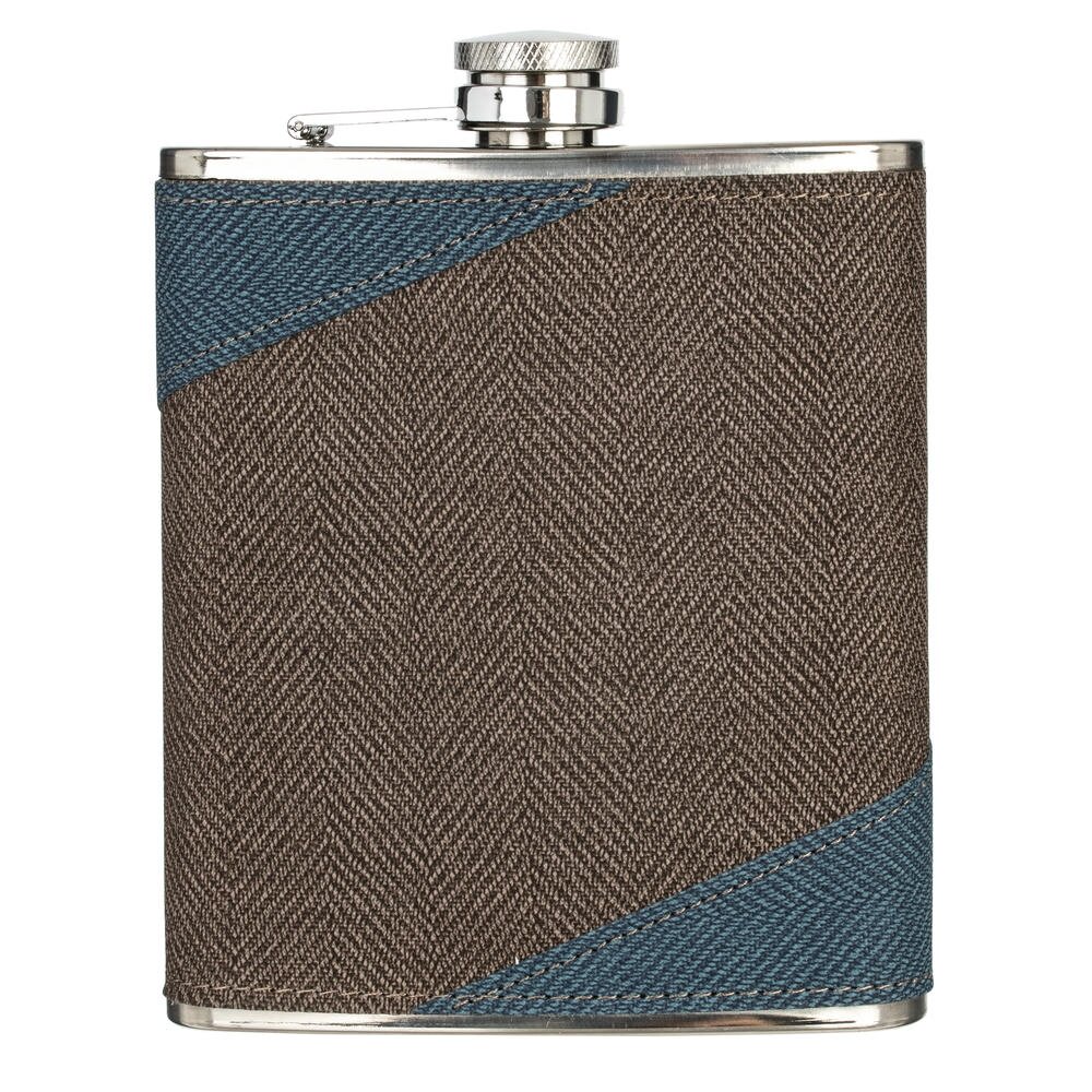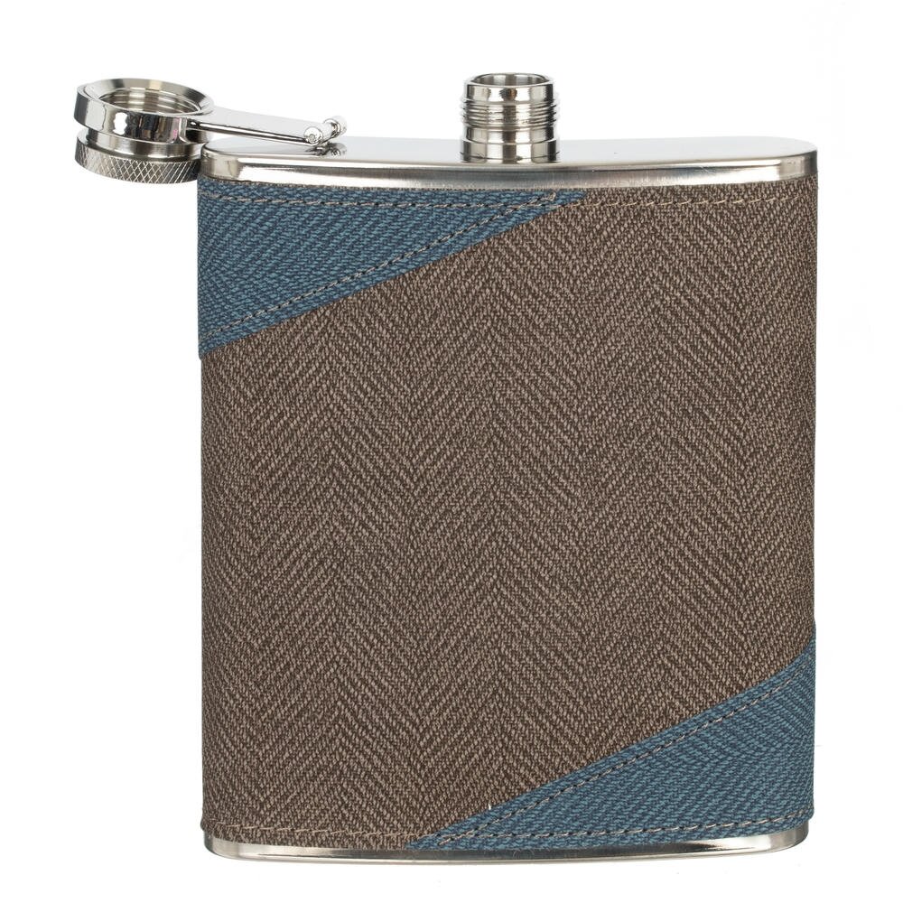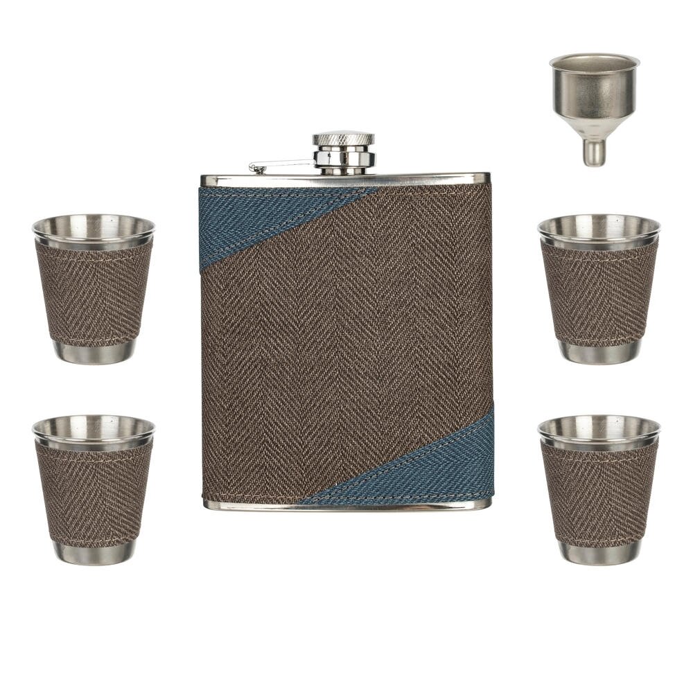 Элегантный подарочный набор в стильной коробке — сочетание практичности и изысканного дизайна. В комплект входят: фляжка объёмом 500 мл из коррозионностойкой стали, украшенная текстильным чехлом с модным геометрическим узором в серо-голубых тонах; четыре компактные стопки с текстильной оплёткой, гармонирующей с фляжкой; удобная металлическая воронка для заправки фляжки.