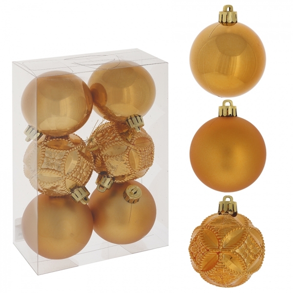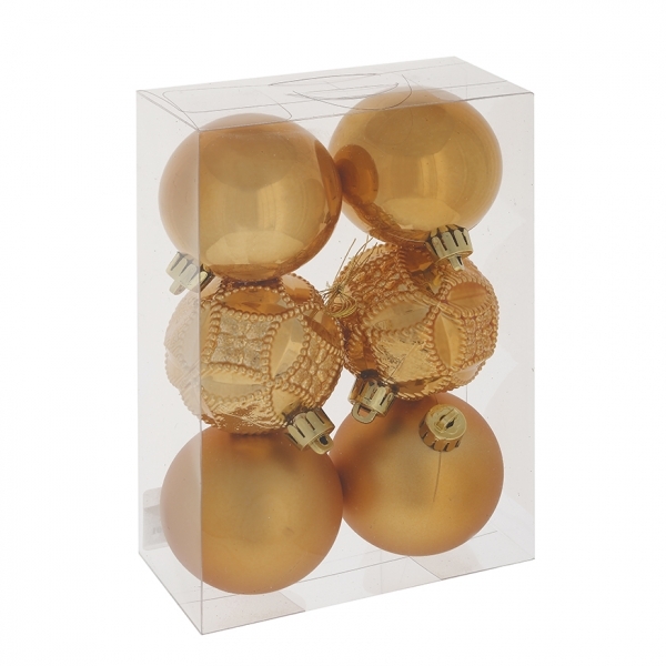 Оригинальный набор из 6-ти елочных шаров золотого цвета. Прекрасно подойдет для праздничного декора новогодней ели и интерьера. Несет в себе волшебство и красоту праздника. Украшения выполнены из пластика. В наборе: шары глянцевые, матовые и рельефные. Поставлются в прозрачной пластиковой упаковке.