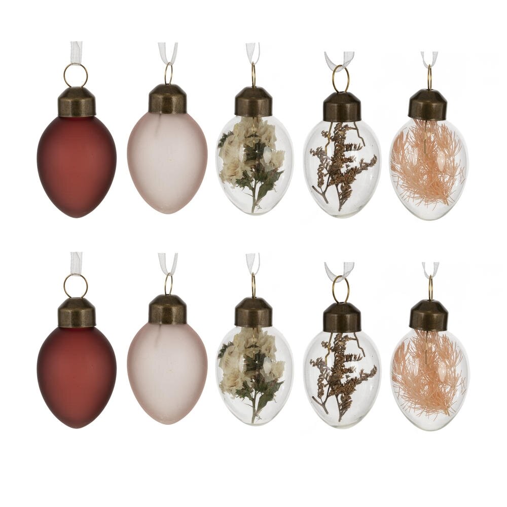 Набор из 9 декоративных подвесных изделий в форме пасхальных яиц, выполненных из качественного стекла. В комплект входят матовые яйца глубокого бордового и нежно?розового оттенков, а также прозрачные яйца с оригинальным наполнением – сухоцветами и легкими перьями пастельных тонов. Металлизированные держатели с петелькой и белыми подвесными ленточками обеспечивают удобное размещение на ветках, пасхальном деревце, венках, композициях или в праздничном букетe. Такой набор станет изысканным украшением интерьера к Пасхе, подчеркнет атмосферу уюта и весеннего обновления, подойдет для сервировки стола, фото-зон и подарочных корзин. Стекло легко очищается от пыли, украшения можно использовать многократно из года в год.