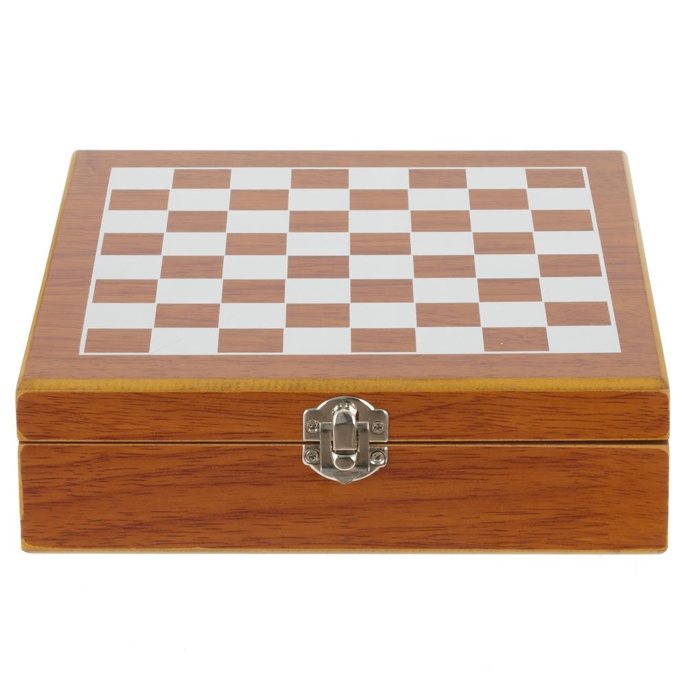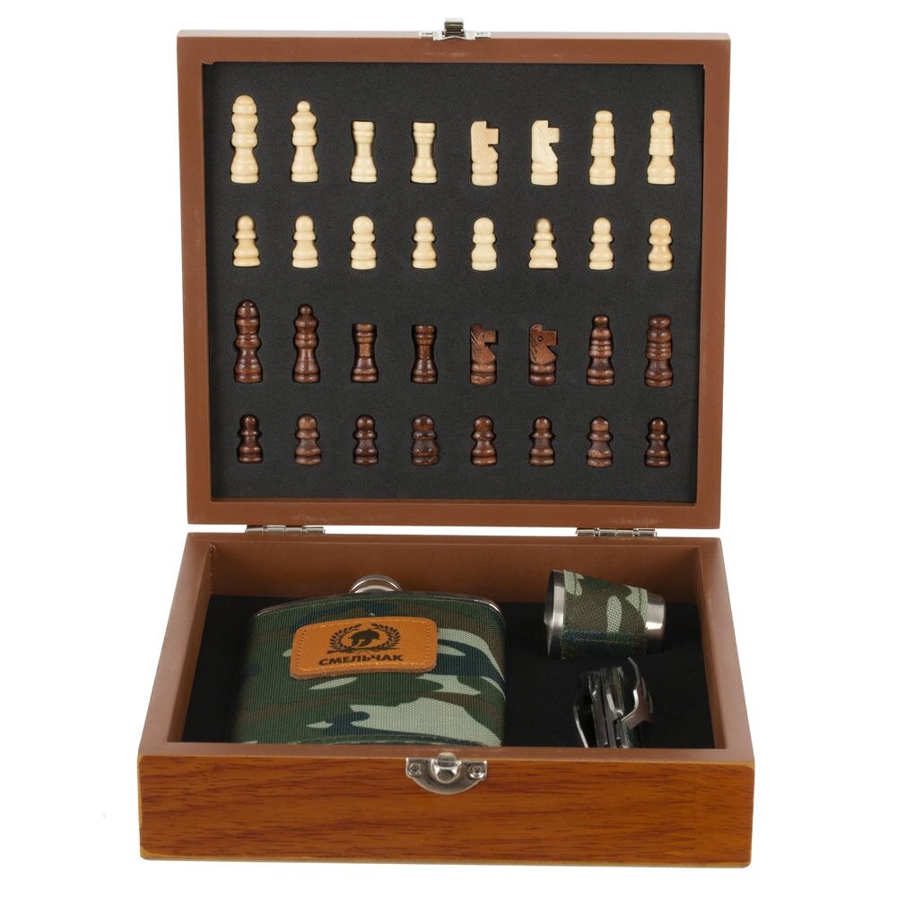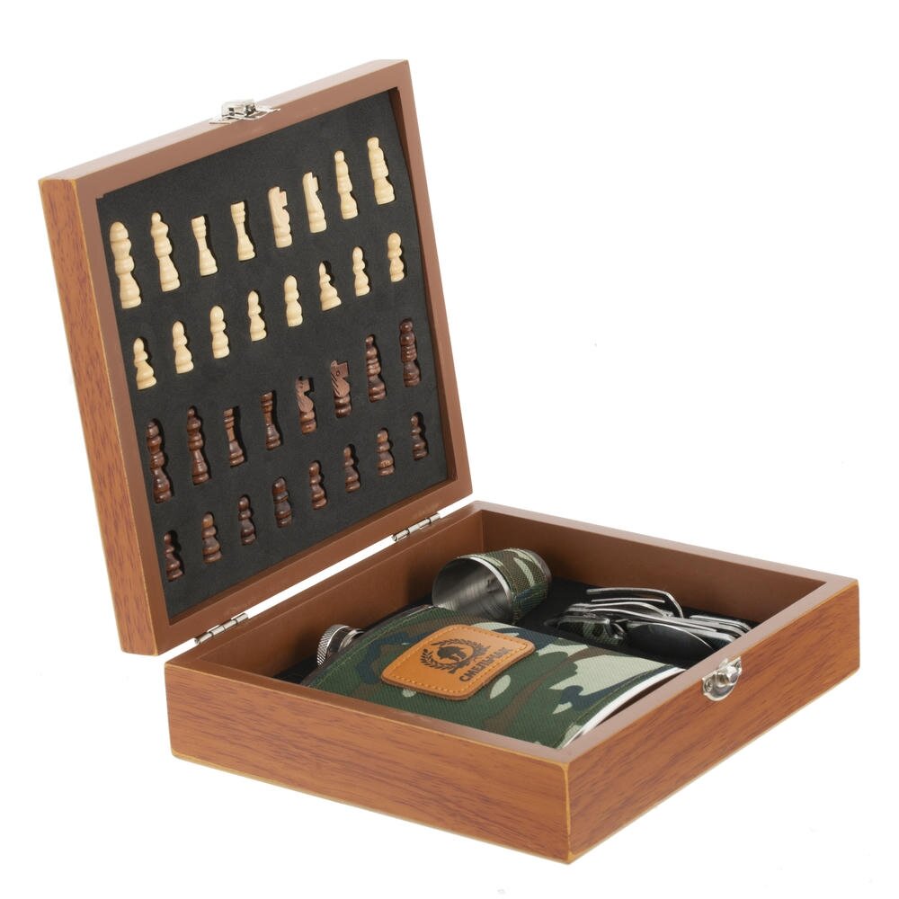 Подарочный набор в стильной деревянной шкатулке — сочетание практичности и досуга. В комплект входят: фляжка объёмом 220 мл с камуфляжным дизайном, классические шахматы с фигурками из дерева, компактный мультитул для мелких задач и стопка объёмом 30 мл из коррозионностойкой стали, оформленная в том же камуфляжном стиле, что и фляжка.