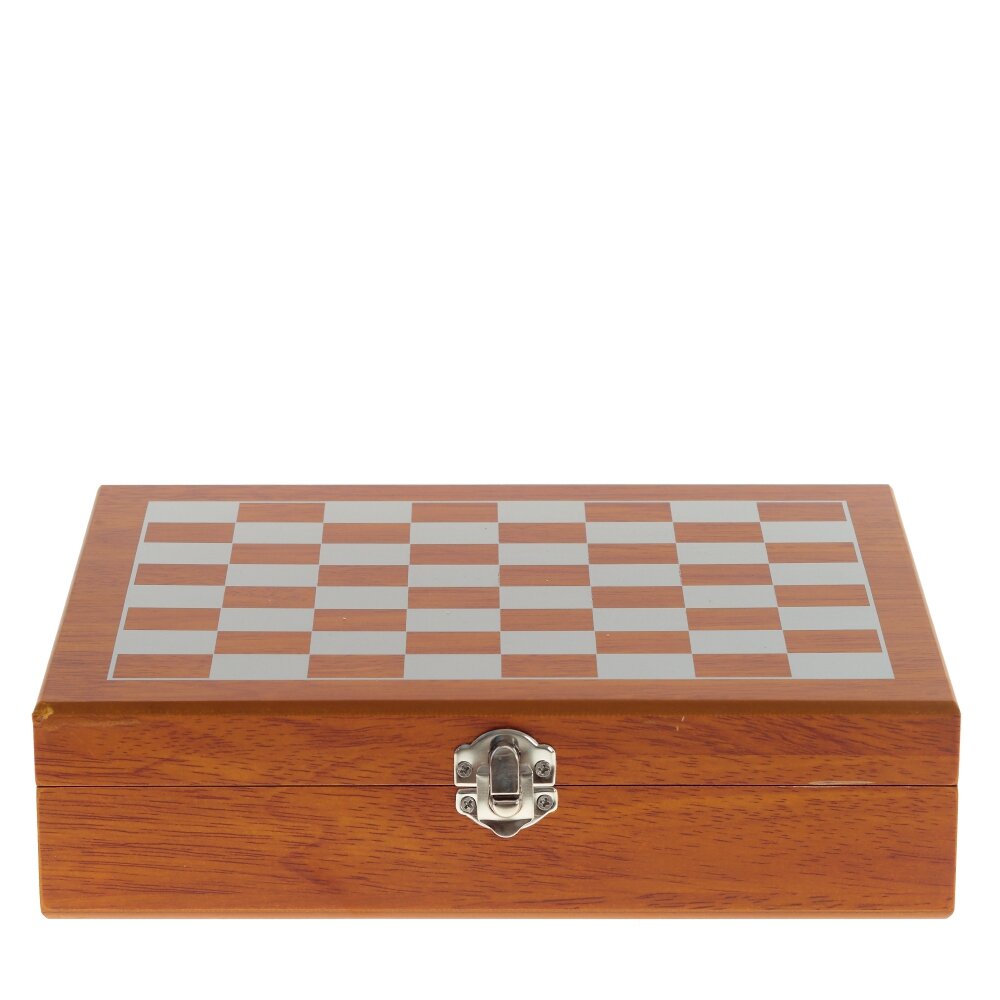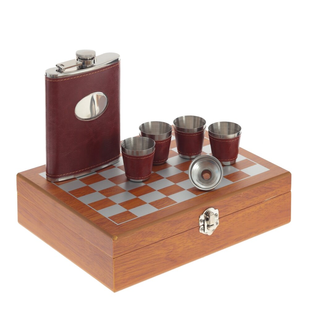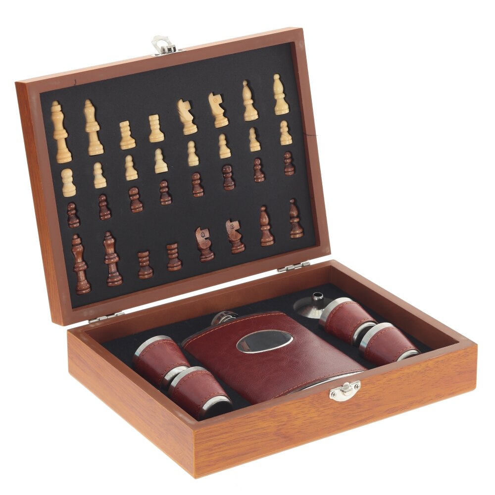 Если Ваш мужчина заядлый шахматист, но при этом искусный ценитель напитков, то этот подарочный набор для него. Набор состоит: из коробки, черно-белых шахматных фигур, фляжки 9,5*2,5*14,5 см 250 мл, 4 стопок 4*4*4 см 30 мл, воронки.
