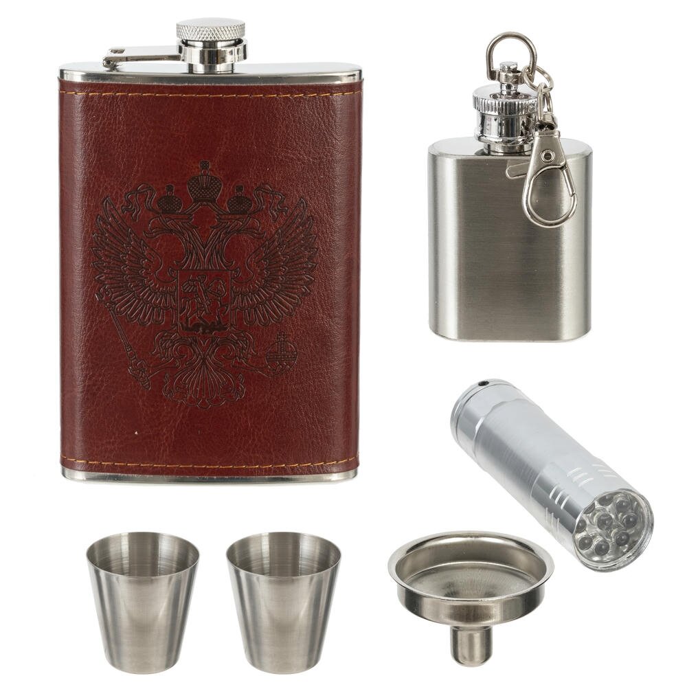 Практичный набор для пикника из 6 предметов в чехле — незаменимая вещь для любителей отдыха на природе. В комплекте: фляжка объёмом 220 мл из коррозионностойкой стали, компактная фляжка, две стопки по 30 мл, удобная воронка и фонарь (работает от трех батареек ААА не прилагаются). Все предметы выполнены из качественных материалов — коррозионностойкой стали и полимеров, отличаются прочностью и долговечностью.