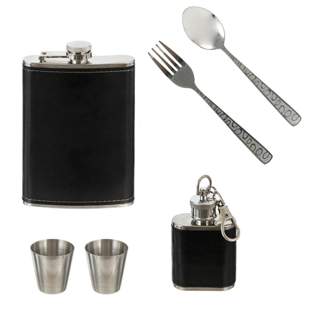 Компактный набор для пикника из 6 предметов в стильном чехле на молнии — незаменимая вещь для выездов на природу. В комплекте: фляжка объёмом 220 мл и дополнительная фляжка из коррозионностойкой стали 50 мл, две стопки по 30 мл, практичная ложка и вилка, объединённые в единый складной прибор. Все предметы выполнены из качественных материалов — коррозионностойкой стали и полимеров, отличаются прочностью и долговечностью.
