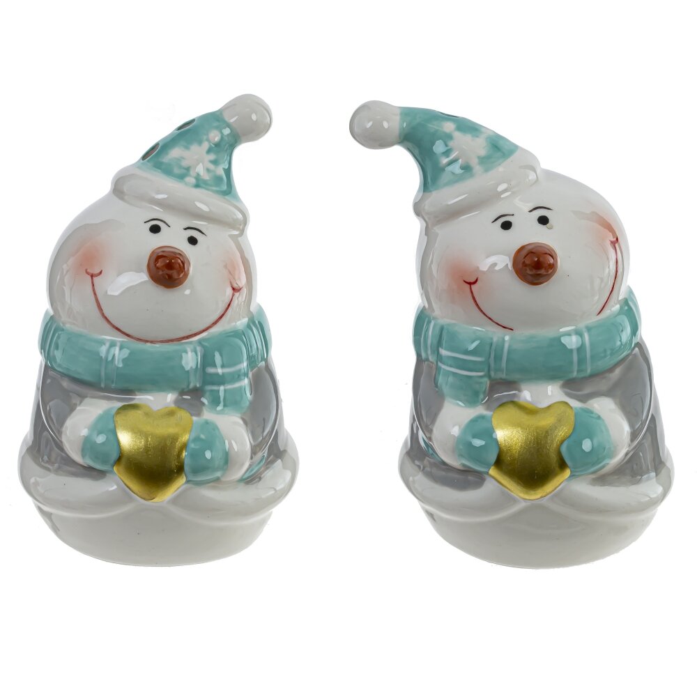 Уникальный набор из двух емкостей для специй "Снеговики: Сердце Зимы", созданный для того, чтобы привнести в ваш дом атмосферу праздника и тепла. Эти два веселых снеговика, как близнецы, одеты в серые шубки и украшены бирюзовыми аксессуарами – шарфами, колпаками и варежками, что делает их не только практичными, но и стильными фигурками для вашей кухни.