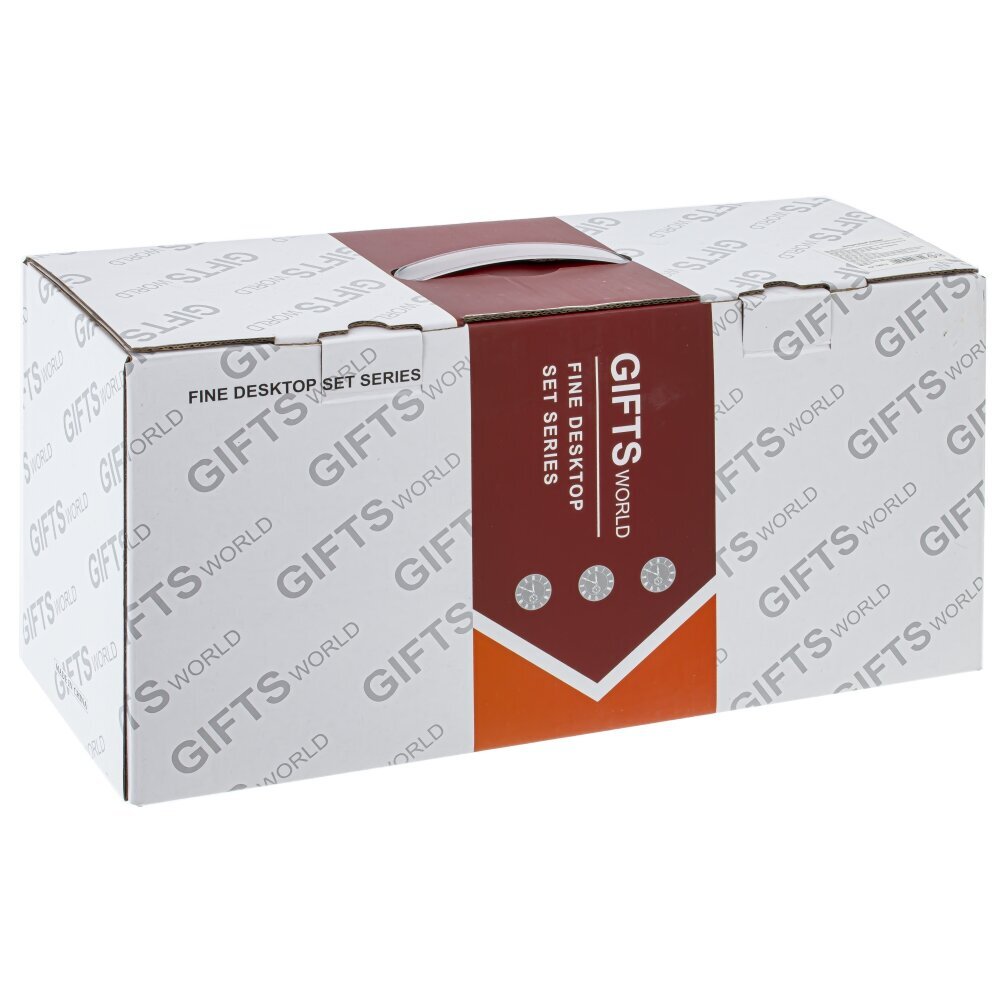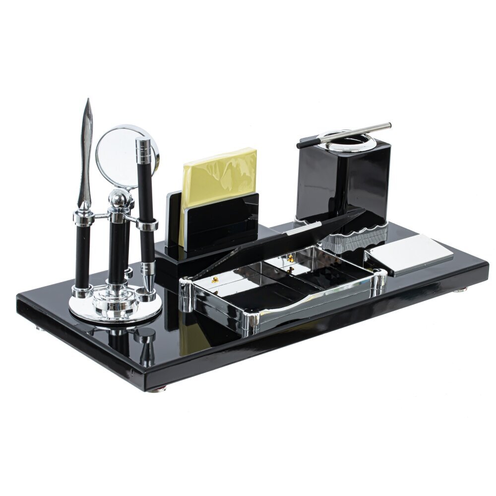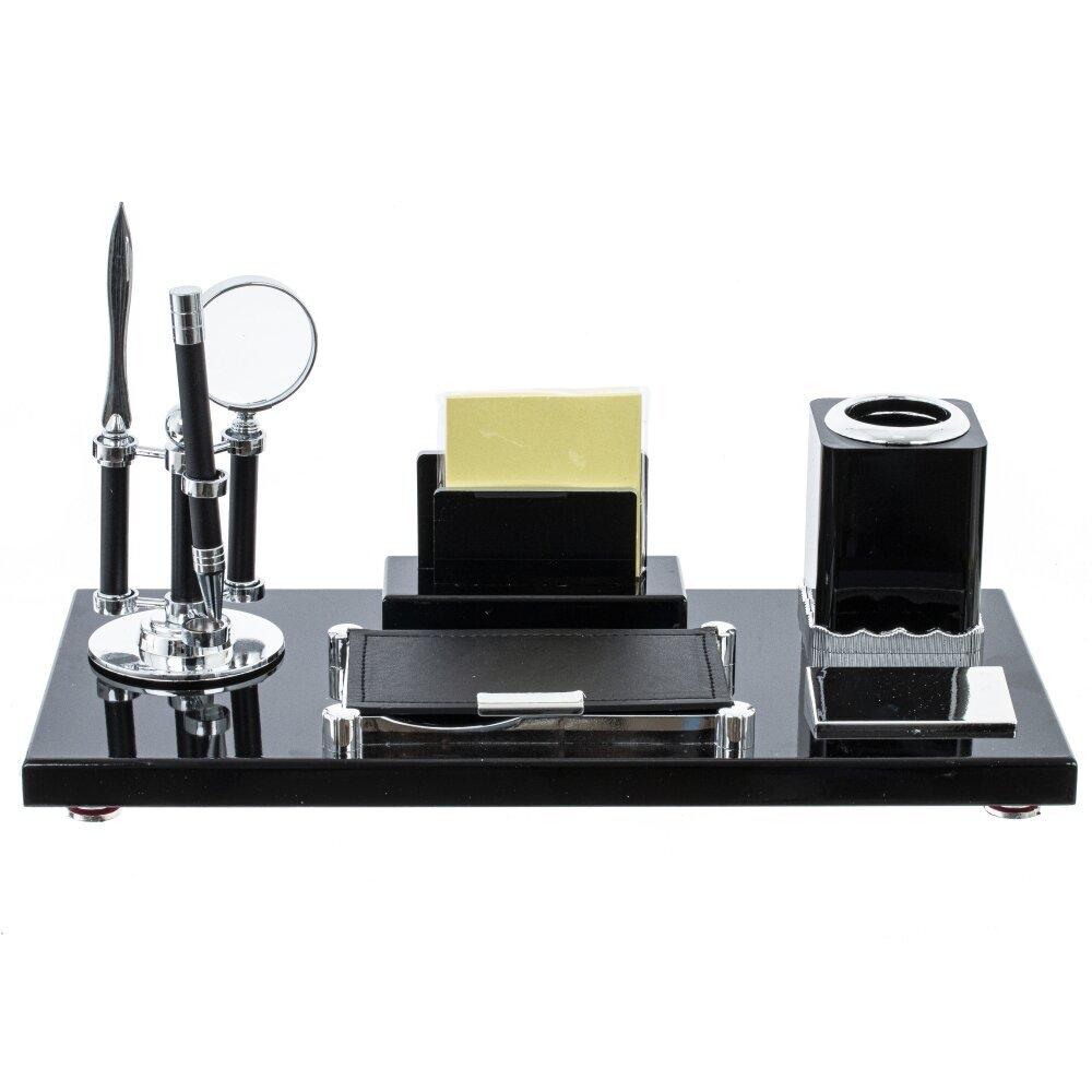 Представлен стильный настольный набор 6 в 1, который идеально подойдет для организации рабочего пространства на офисном столе или дома. Комплект включает в себя подставку для ручек, лупу, держатель для визиток, нож для вскрытия писем, подставку для бумажных стикеров и подставку для карандашей. Основание набора выполнено из дерева, что придаёт ему солидность и служит надежной основой для всех аксессуаров. Металлические элементы подчеркивают современный дизайн, добавляя блеск и изысканность. Полимерные материалы, использованные в конструкции, обеспечивают долговечность и простоту ухода за изделием. Этот набор не только функционален, но и эстетически привлекателен, благодаря сочетанию чёрного цвета, древесных и металлических деталей. Такой аксессуар станет отличным подарком для коллеги, руководителя или для собственного пользования, делая рабочее место более удобным и организованным.