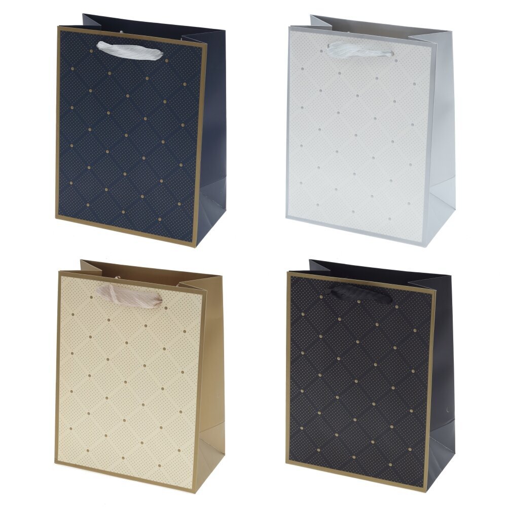 Оформите даже самый скромный подарок, положив его в нарядный пакет. Это не только сделает подарок более презентабельным, но также упростит его транспортировку. Бумажный пакет вместителен за счет широкого дна. Это позволит легко вложить в него упакованный в картонную коробку предмет. Плотность бумаги 230г/м2 гарантирует прочность и надежность упаковки. Кроме того, стильный дизайн пакета добавит нотку элегантности к вашему подарку, делая его привлекательным. Представлен в четырех вариантах. В блоке 12 шт (микс).