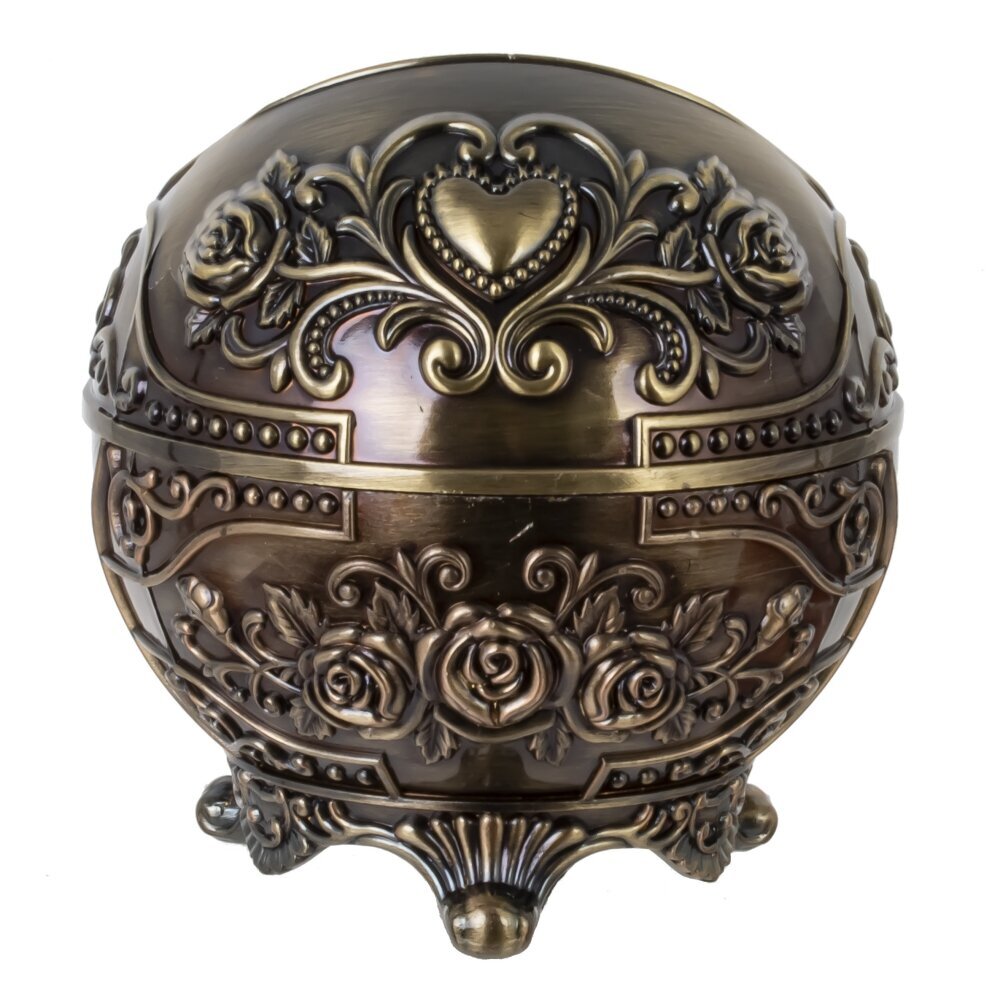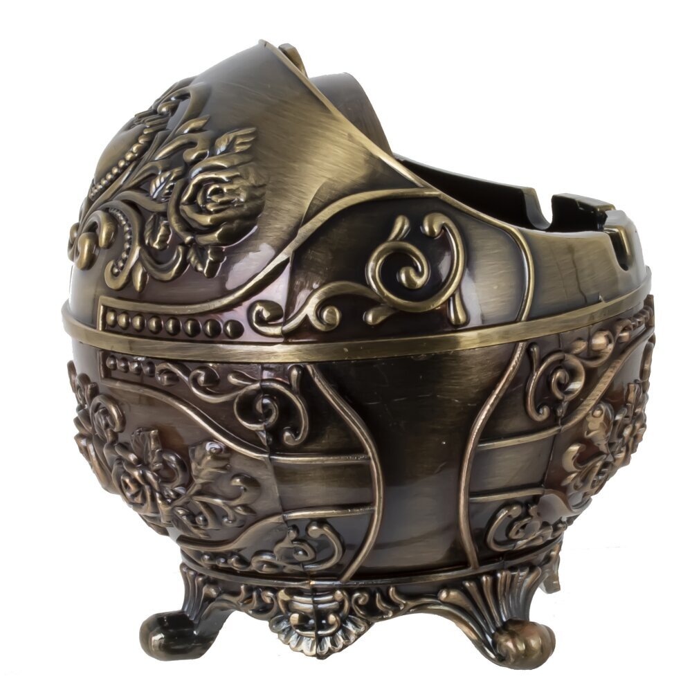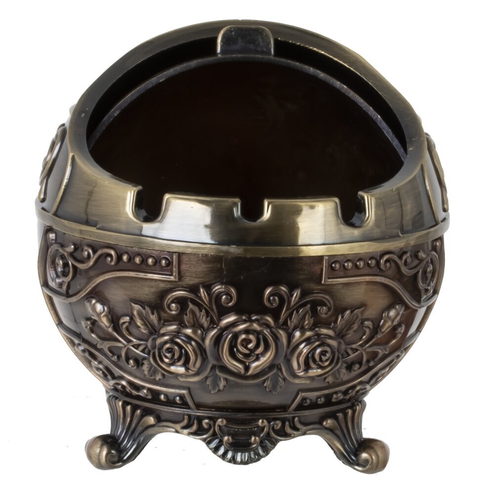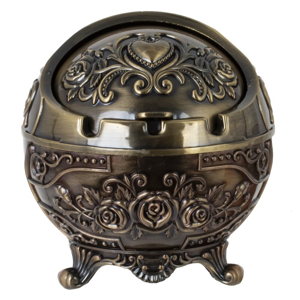 Металлическая пепельница, выполненная в изысканном классическом стиле. Корпус изделия имеет сферическую форму и украшен объемной декоративной резьбой: по бокам и на крышке изображены роскошные цветы, преимущественно розы, а также орнаменты, напоминающие завитки и жемчужины. Особое внимание привлекает верхняя часть пепельницы, в центре которой размещено рельефное изображение сердца, окруженное цветочными узорами. Цвет изделия — бронзовый с легким золотистым отблеском, благодаря чему пепельница выглядит как антикварная вещь. Три изящные ножки придают ей устойчивость и подчеркивают элегантность. Это не просто утилитарный предмет, а настоящее украшение интерьера, способное добавить шарм и благородство в любой дом или офис.