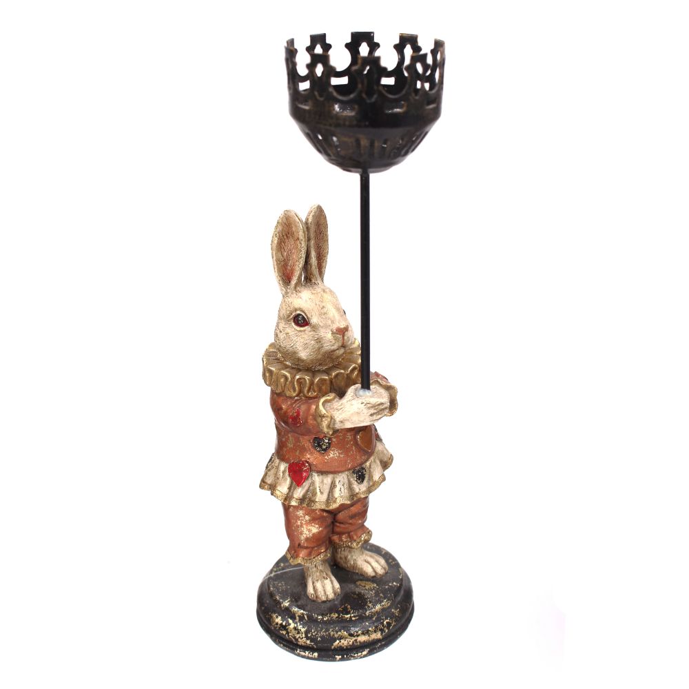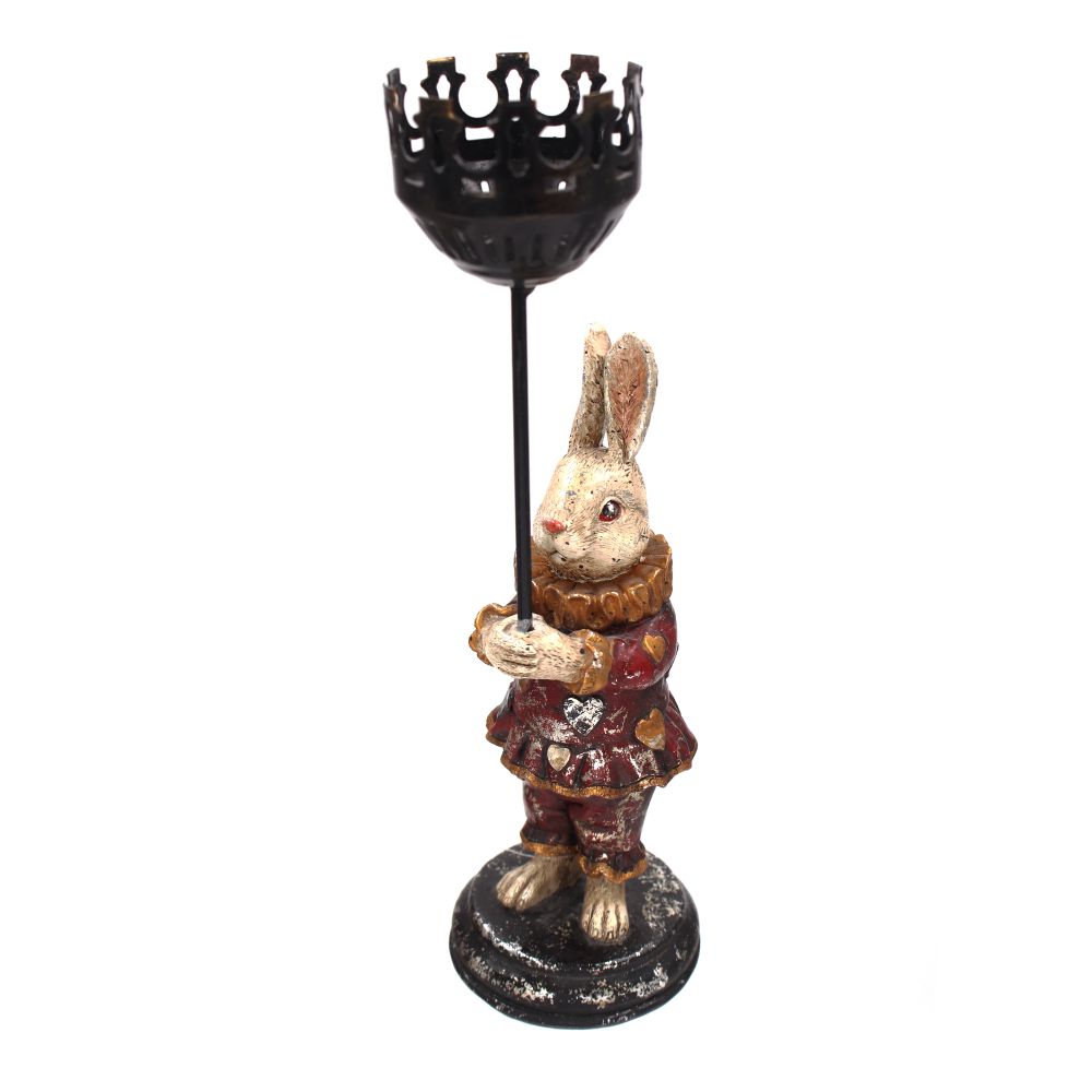 Подсвечник декоративный в виде фигурки кролика для одной свечи. Красота этого персонажа вне конкуренции. Его роскошный наряд притягивает, а воображение рисует удивительный сказочный дворец. Представлен в двух вариантах.