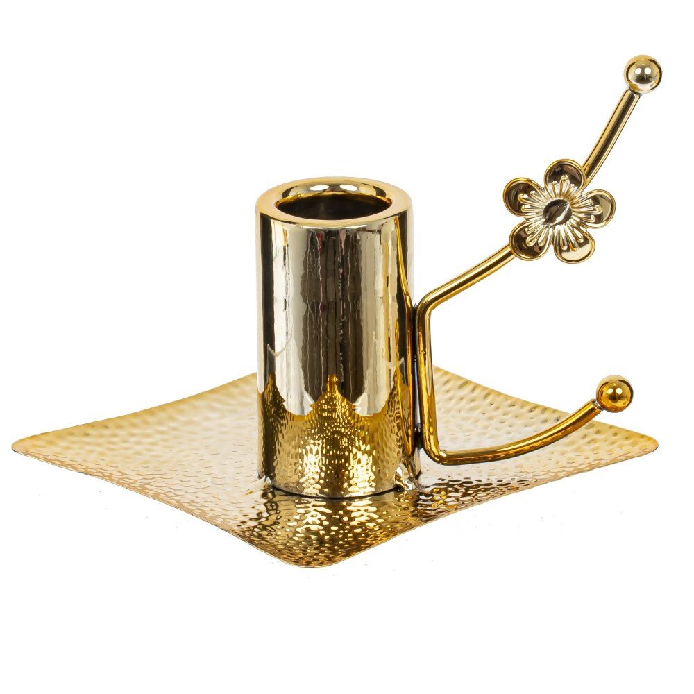 Стильный подсвечник для одной свечи. Он выполнен в золотом цвете, добавляющем нотки роскоши и блеска в ваш интерьер. Уникальность этого подсвечника подчеркивается прекрасно продуманной деталью - удобной ручкой, расположенной сбоку. Устойчивая подставка подарит уверенность в стабильности подсвечника, предотвращая его скольжение или переворачивание даже при легком касании. Благодаря этому, вы сможете наслаждаться светом и теплом горящей свечи без беспокойства о безопасности. Предназначен для свечи, диаметром 2,5 см.