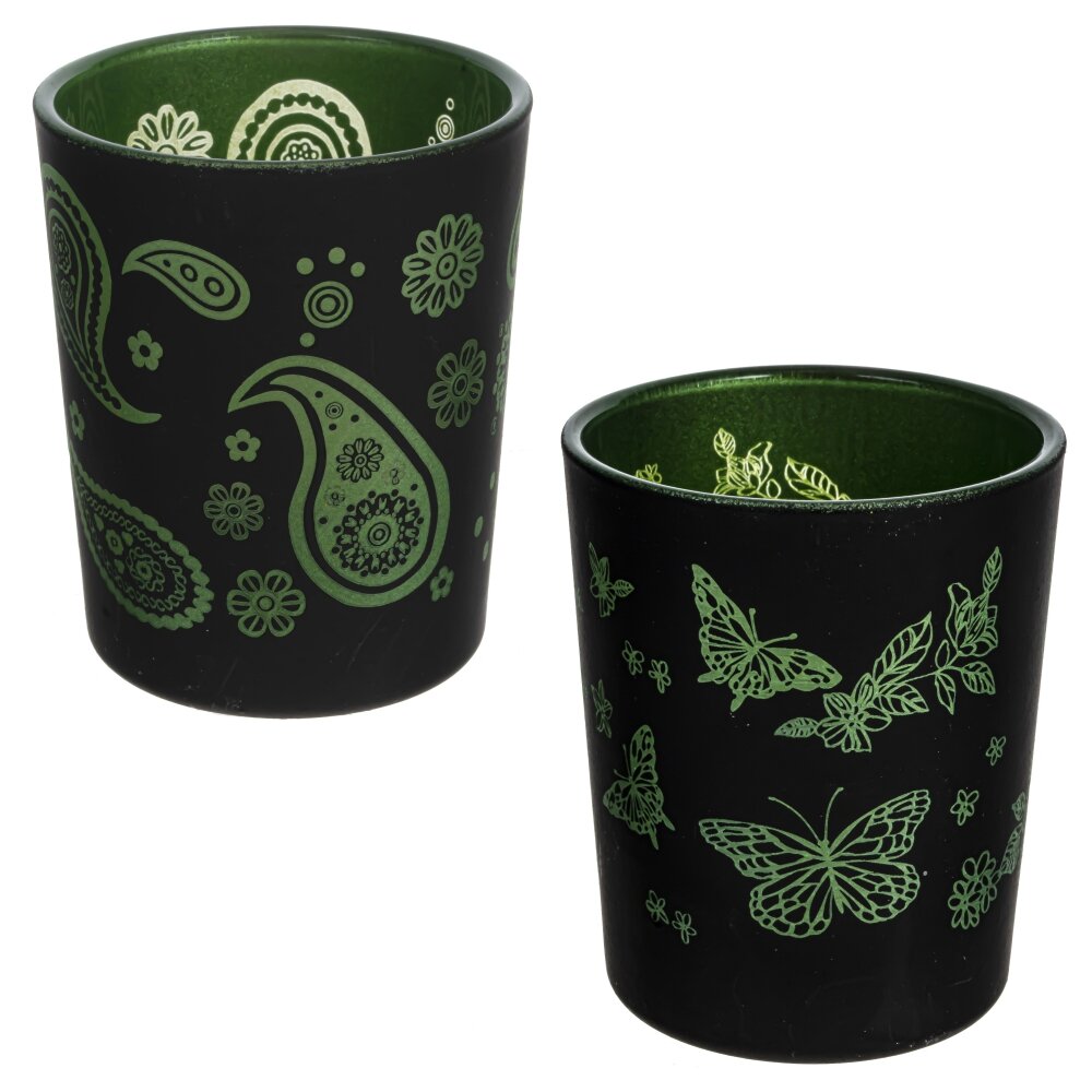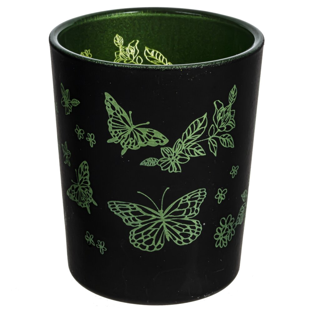 Подсвечник из стекла станет стильным украшением вашего интерьера и создаст уютную атмосферу в любом помещении. Он выполнен из стекла с оригинальным матовым покрытием. Внешняя сторона украшена изящными рисунками бабочек и цветов, которые смотрятся эффектно и загадочно. Внутренняя поверхность — насыщенного зеленого оттенка, что при зажигании свечи придаёт подсвечнику особое мягкое свечение и таинственное мерцание. Такой подсвечник идеально подойдет для романтических вечеров, медитаций, а также станет приятным подарком для ценителей красивых и функциональных аксессуаров для дома. Компактные размеры позволяют разместить его как на столе, так и на подоконнике. Для свечей, диаметром 5,5 см. Представлено в двух вариантах.
