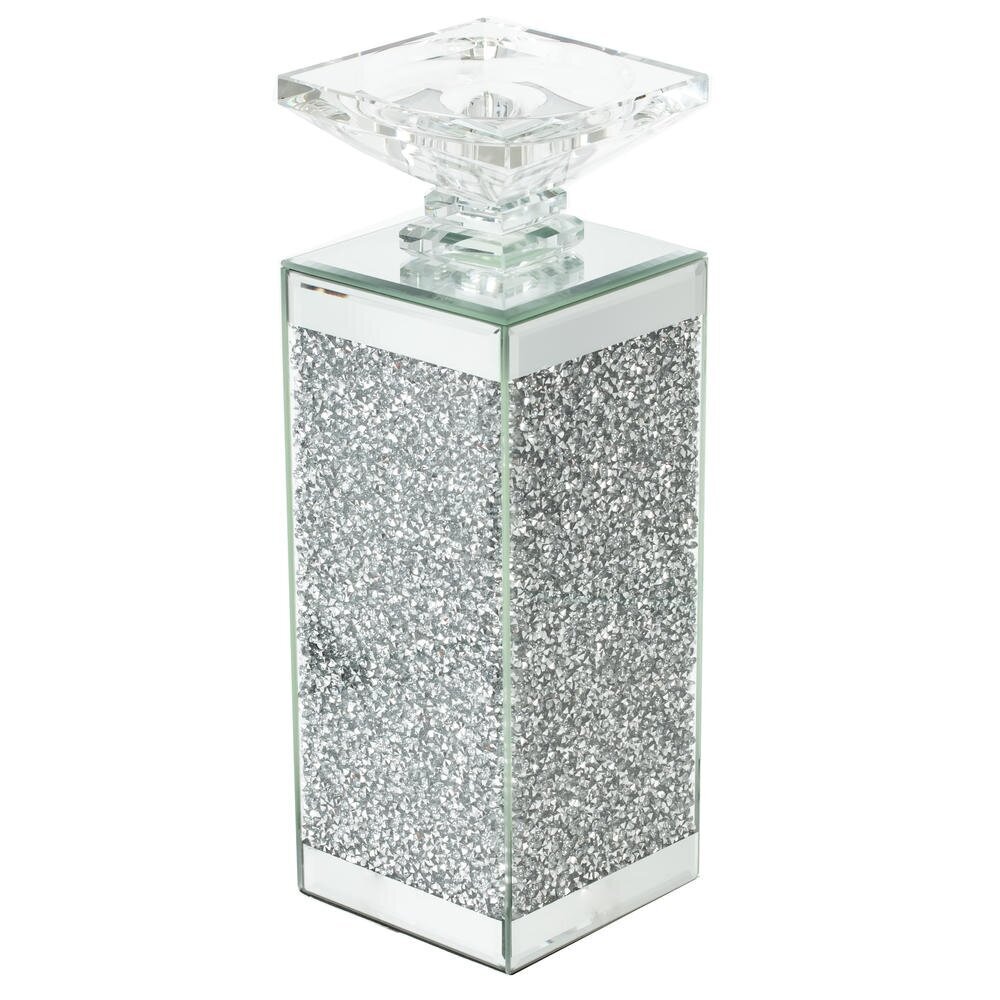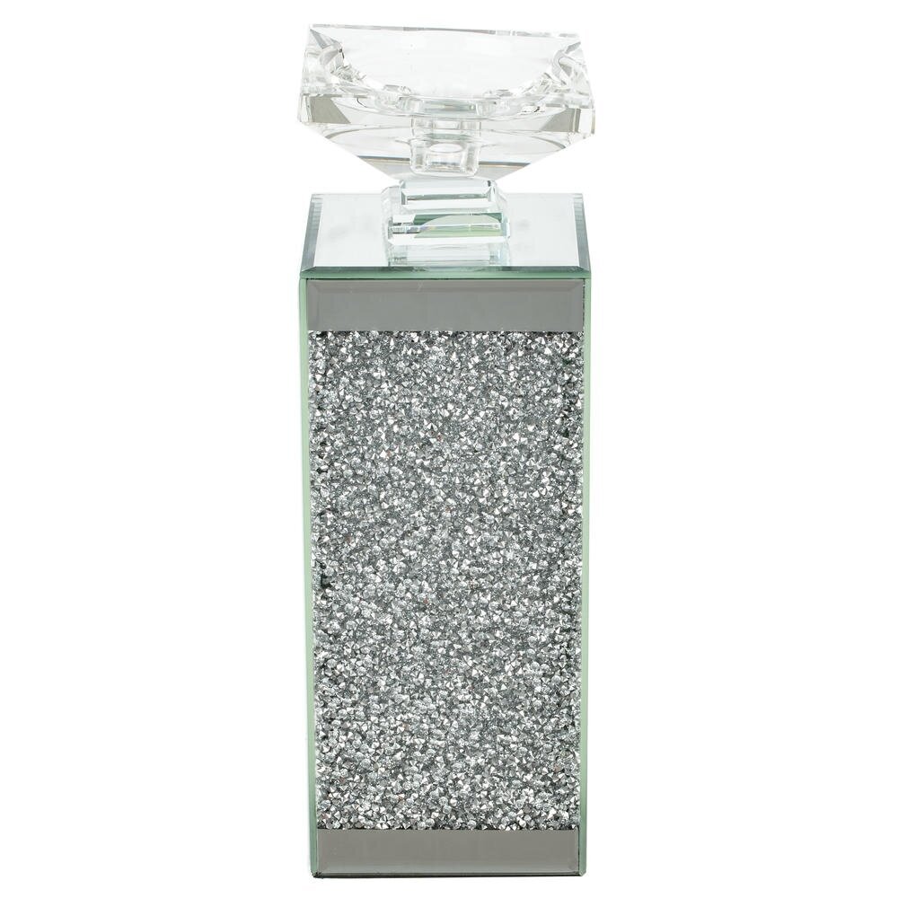 Элегантный стеклянный подсвечник в современном стиле. Корпус выполнен в виде прямоугольной колонны из прозрачного и зеркального стекла, центральную часть украшает эффектная серебристая крошка, создающая мерцающее «кристальное» сияние. В верхней части расположена изящная гранёная чаша для таблетки?свечи или небольшой ароматической свечи. При зажигании огня свет красиво отражается в стеклянных гранях и блёстках, наполняя помещение атмосферой уюта и роскоши. Такой подсвечник станет заметным акцентом в гостиной, спальне или на праздничном столе, гармонично дополняя интерьеры в стиле модерн, гламур, арт?деко. Отличный вариант подарка и стильный элемент декора для дома, салона красоты или отеля. Для свечи, диаметром 2 см.