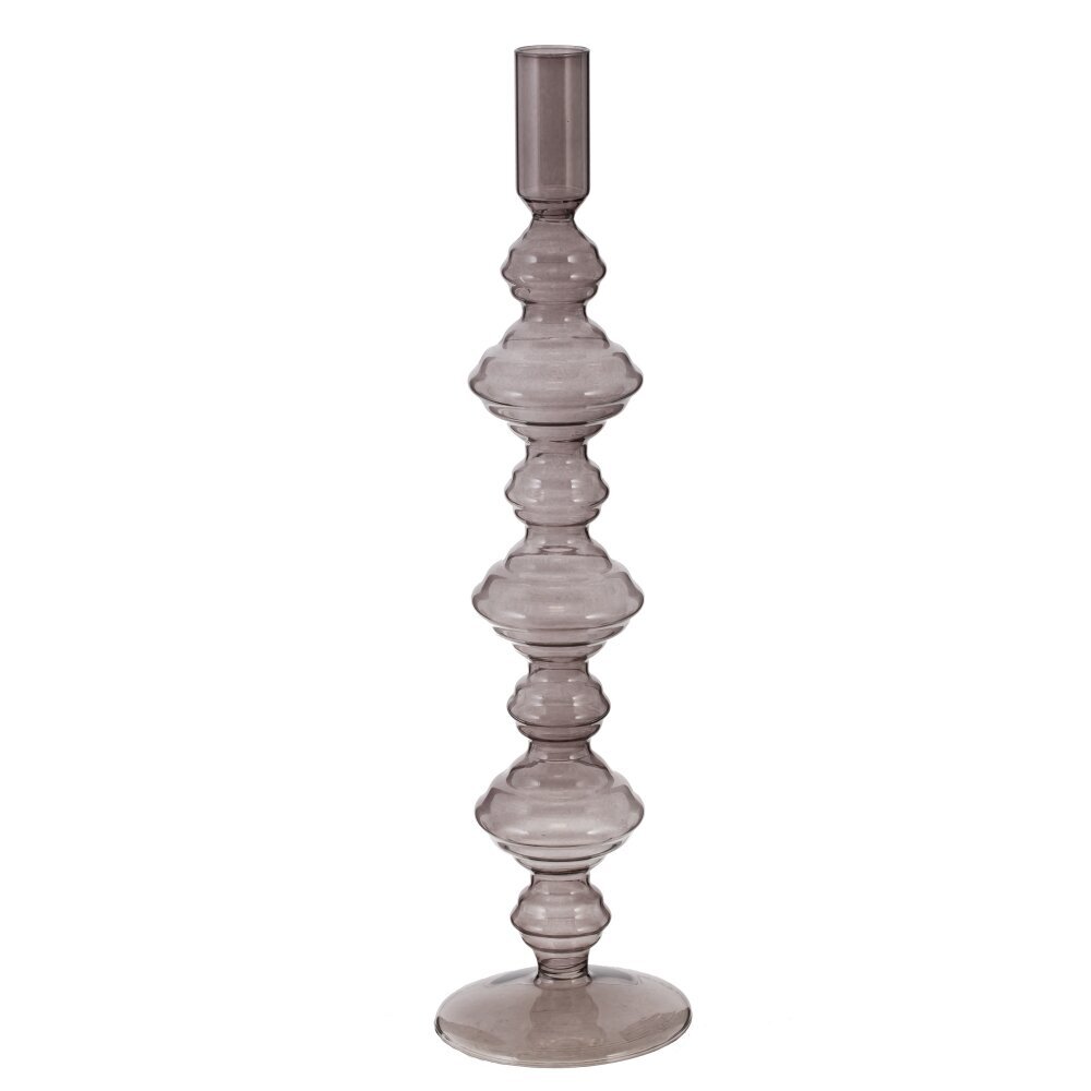Изящный стеклянный подсвечник из полупрозрачного стекла серого цвета. Силуэт построен из плавно переходящих друг в друга округлых сегментов с легкой продольной фактурой, что придает предмету скульптурность и игру бликов. Сверху — цилиндрическая чашечка для тонкой свечи-столбика или классической свечи. Широкое устойчивое основание надежно фиксирует подсвечник на поверхности и собирает свет, создавая мягкое свечение. Гладкие обработанные края и яркий глянец делают вещь аккуратной и нарядной. Такой подсвечник станет выразительным акцентом на сервировке, подоконнике или консоли, подходит к современным, сканди и эклектичным интерьерам, красиво смотрится парой или группой с белыми и бордовыми свечами.