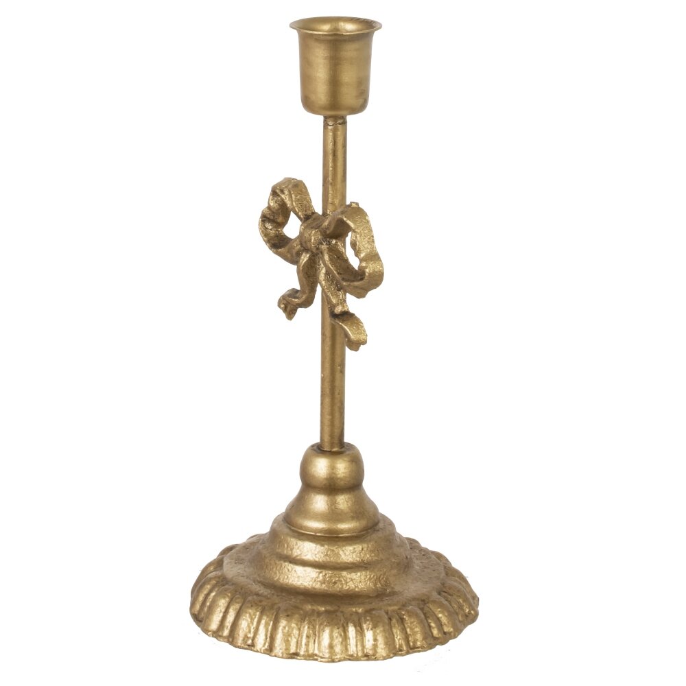 Элегантный металлический подсвечник золотистого цвета. Основание изделия выполнено в виде рифлёного круга, придающего устойчивость и визуальную массивность. В центре расположена высокая тонкая ножка, плавно переходящая в держатель для свечи, диаметром 2,5 см. Особое внимание привлекает декоративный элемент в виде изящного банта, украшающего центральную часть подсвечника. Такой аксессуар способен стать изысканным дополнением для интерьера в классическом или винтажном стиле, добавив в обстановку уют и нотки роскоши. Металлический материал обеспечивает долговечность и прочность изделия, а его благородный блеск подчеркивает утонченность вкуса владельца. Этот подсвечник отлично впишется как в праздничную сервировку стола, так и в повседневное оформление гостиной, создавая атмосферу уюта и тепла.