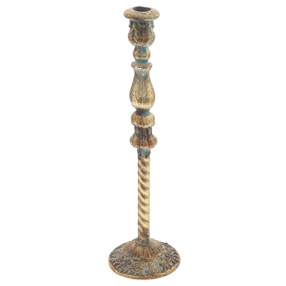 Элегантный металлический подсвечник с выраженным эффектом старины. Высокая стройная форма, фигурная чаша под тонкую свечу и изящная ножка с витой средней частью создают образ антиквариата. Круглое основание украшено рельефным орнаментом, что повышает устойчивость и придает предмету декоративную выразительность. Цвет — теплый оттенок бронзы с благородной зеленовато-голубой патиной, подчеркивающей фактуру. Подсвечник уместен в классическом, винтажном или прованском интерьере, на каминной полке, сервированном столе или в композиции с другими декоративными объектами. Гармонично дополняет вечернее освещение, создавая мягкое, камерное настроение. Рекомендуется использовать на ровной поверхности и бережно протирать мягкой сухой тканью без абразивов. Отличный подарок для ценителей атмосферных деталей. Для свечи диаметром 2 см.
