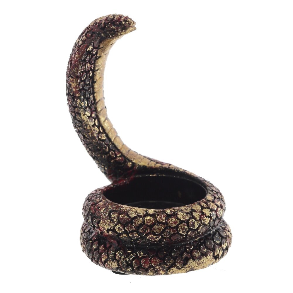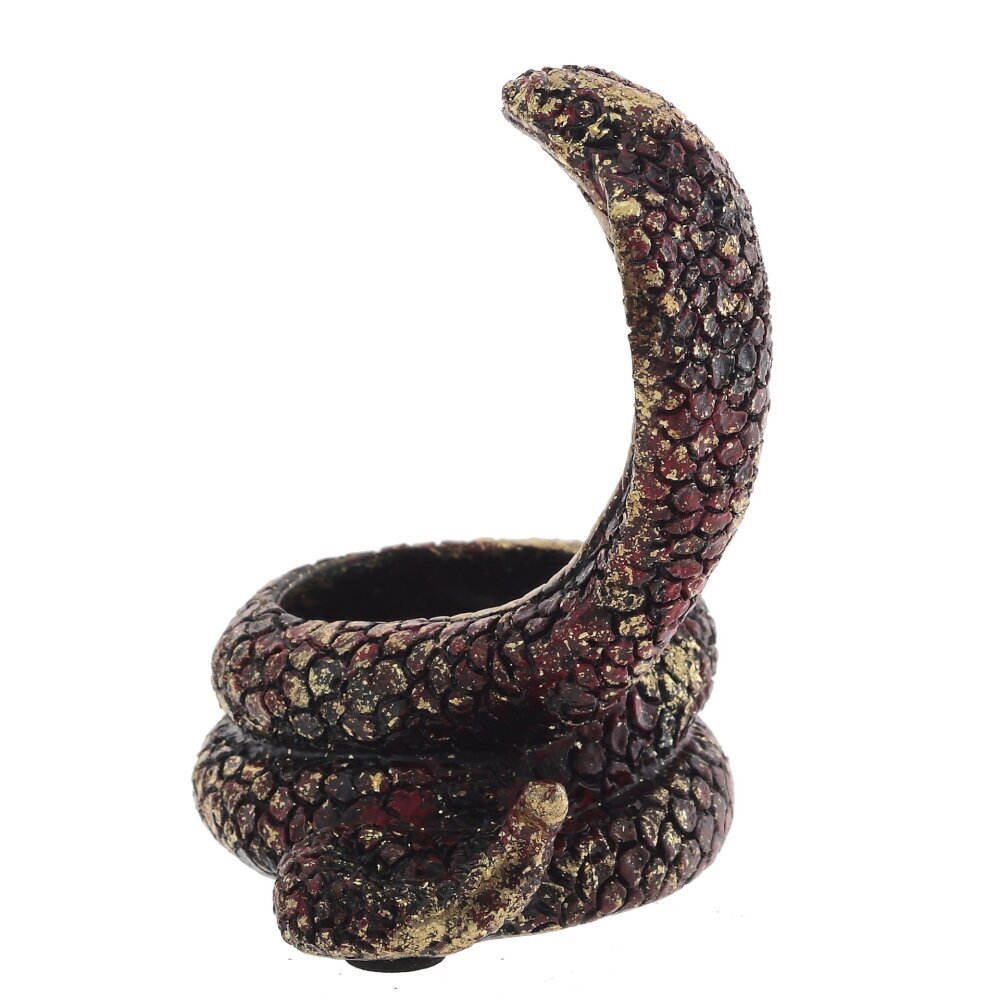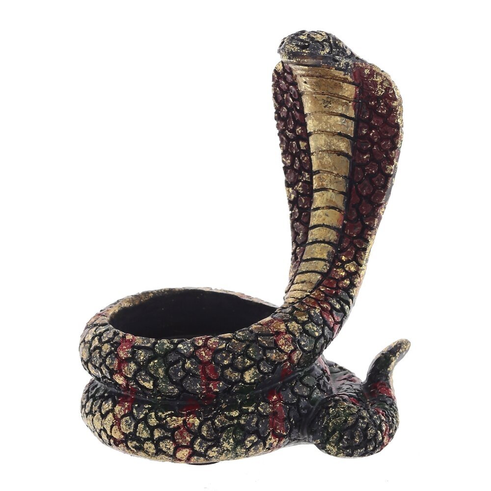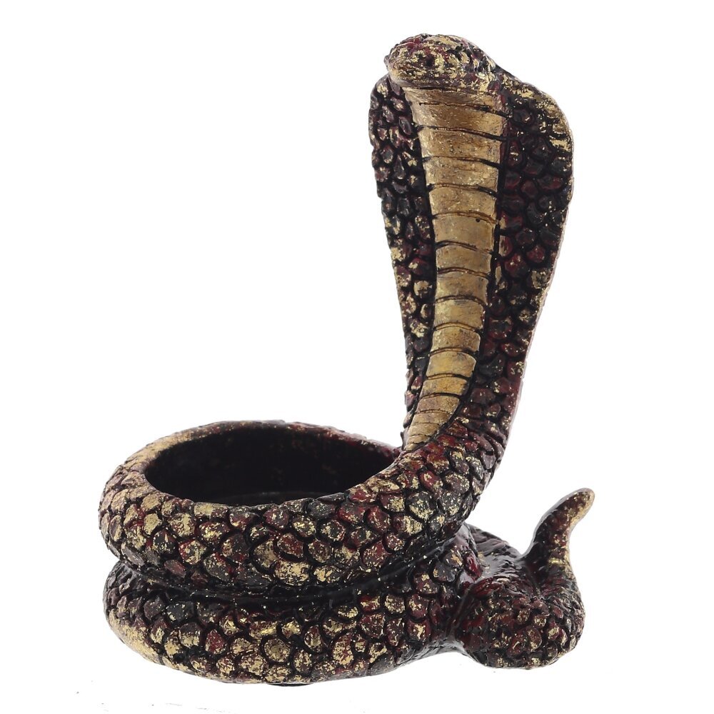 Декоративный подсвечник в форме змейки-кобры выполненный из полистоуна имеет форму закрученной в кольцо змеи с распущенным капюшоном. В углубление для свечи диаметром 4 см можно поставить свечу. Фигурка кобры прекрасно детализирована, с чешуйками покрытыми золотой патиной. Подсвечник доступен в двух вариантах.