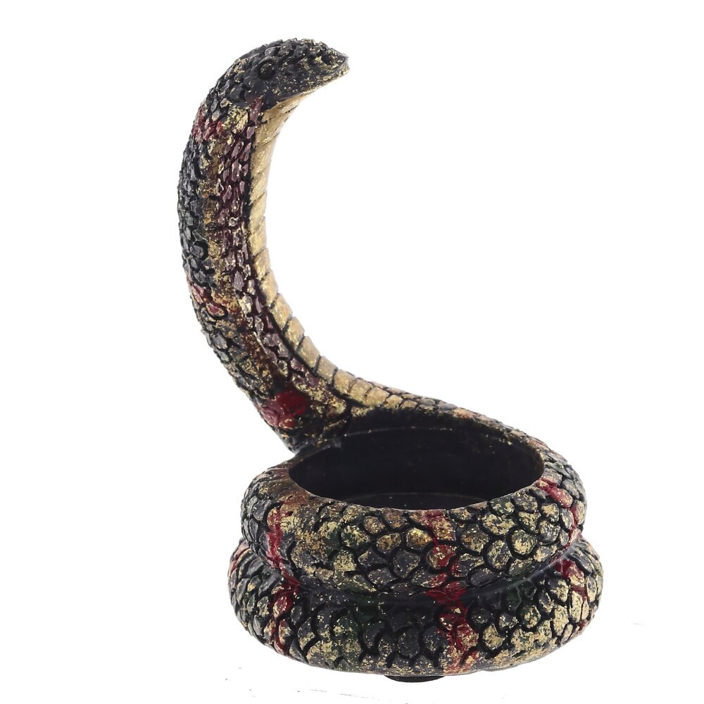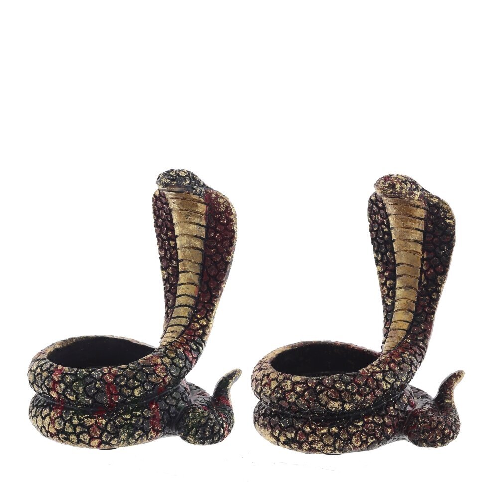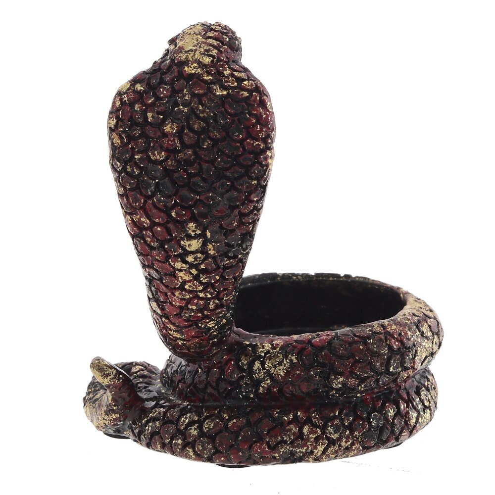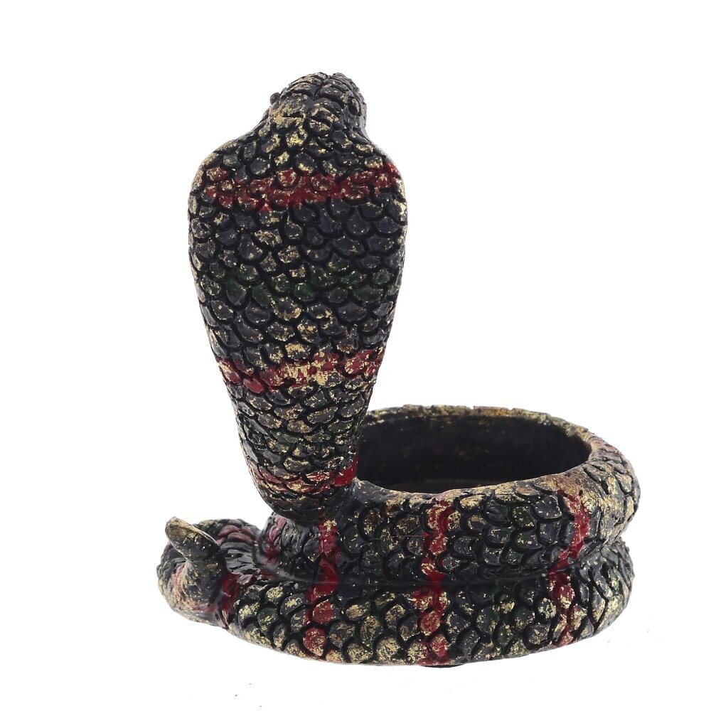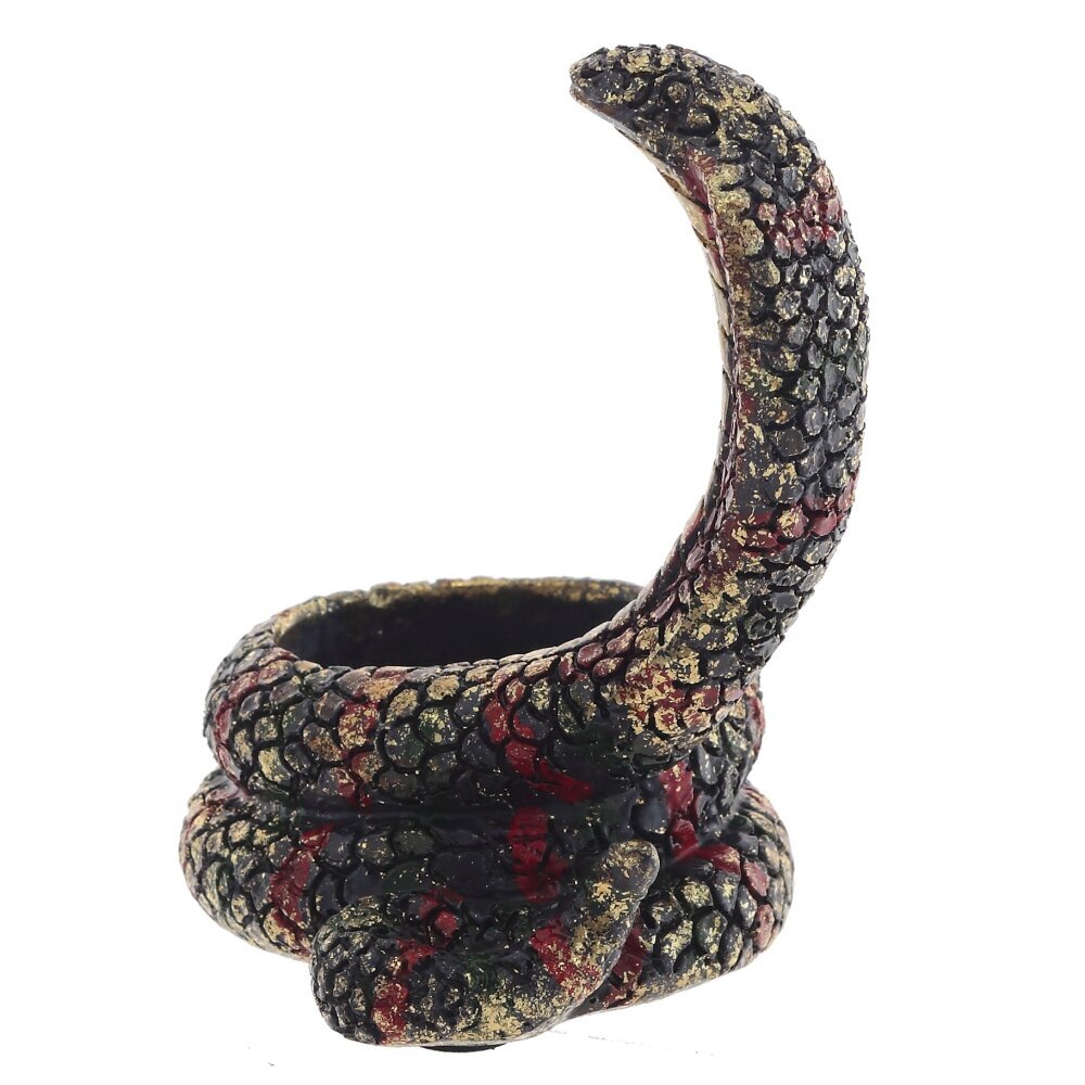 Декоративный подсвечник в форме змейки-кобры выполненный из полистоуна имеет форму закрученной в кольцо змеи с распущенным капюшоном. В углубление для свечи диаметром 4 см можно поставить свечу. Фигурка кобры прекрасно детализирована, с чешуйками покрытыми золотой патиной. Подсвечник доступен в двух вариантах.