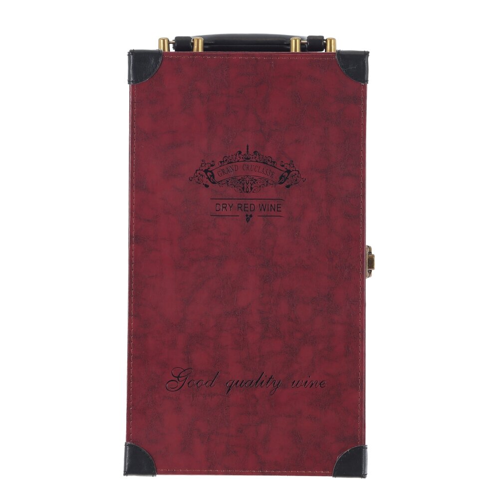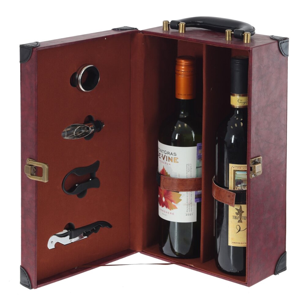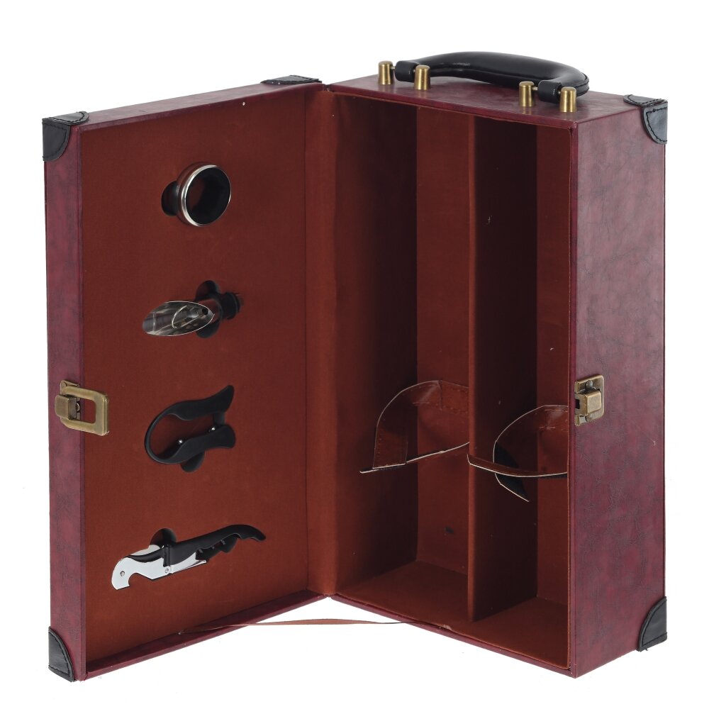 Шкатулка для двух бутылок, в комплект которой входит и дополнительные аксессуары для сомелье. Упакуйте выбранные напитки в шкатулку, и ваш подарок будет выглядеть весьма презентабельно. Выполнена из экокожи в форме чемоданчика. В набор входит: штопор, пробка-дозатор, кольцо, нож для фольги.