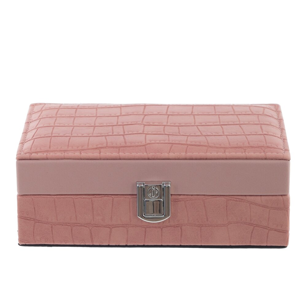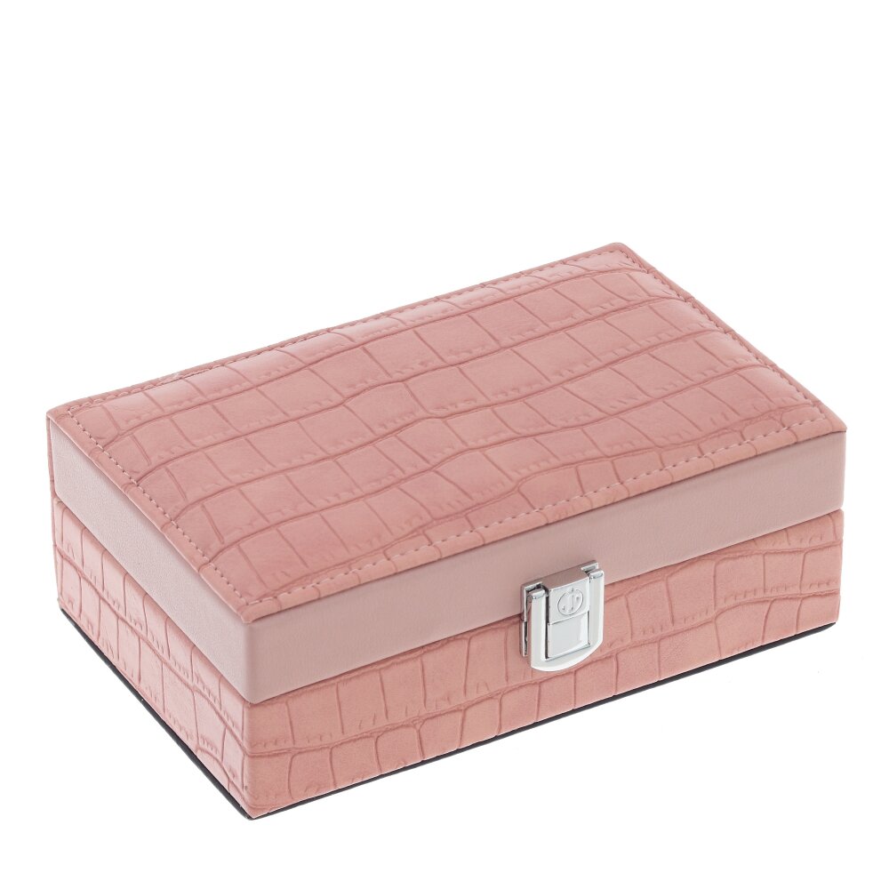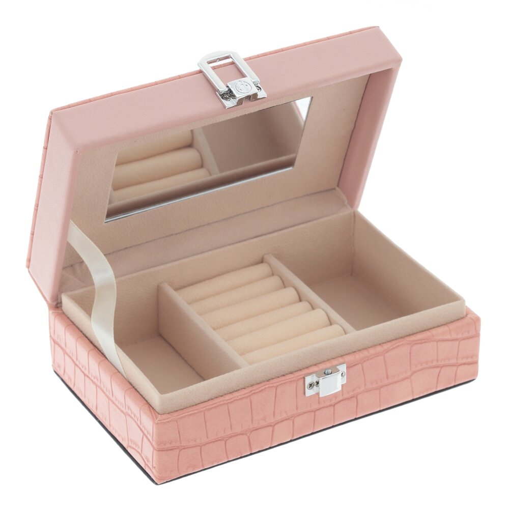 Шкатулка для украшений состоит из одного отделения, разделенного на три секции, одна из которых с валиками для колец. Отделка внутренней поверхности бархатистой тканью предохраняет ювелирные изделия от царапин. На внутренней стороне откидной крышки имеется зеркальце. Закрывается шкатулка на металлическую защелку.