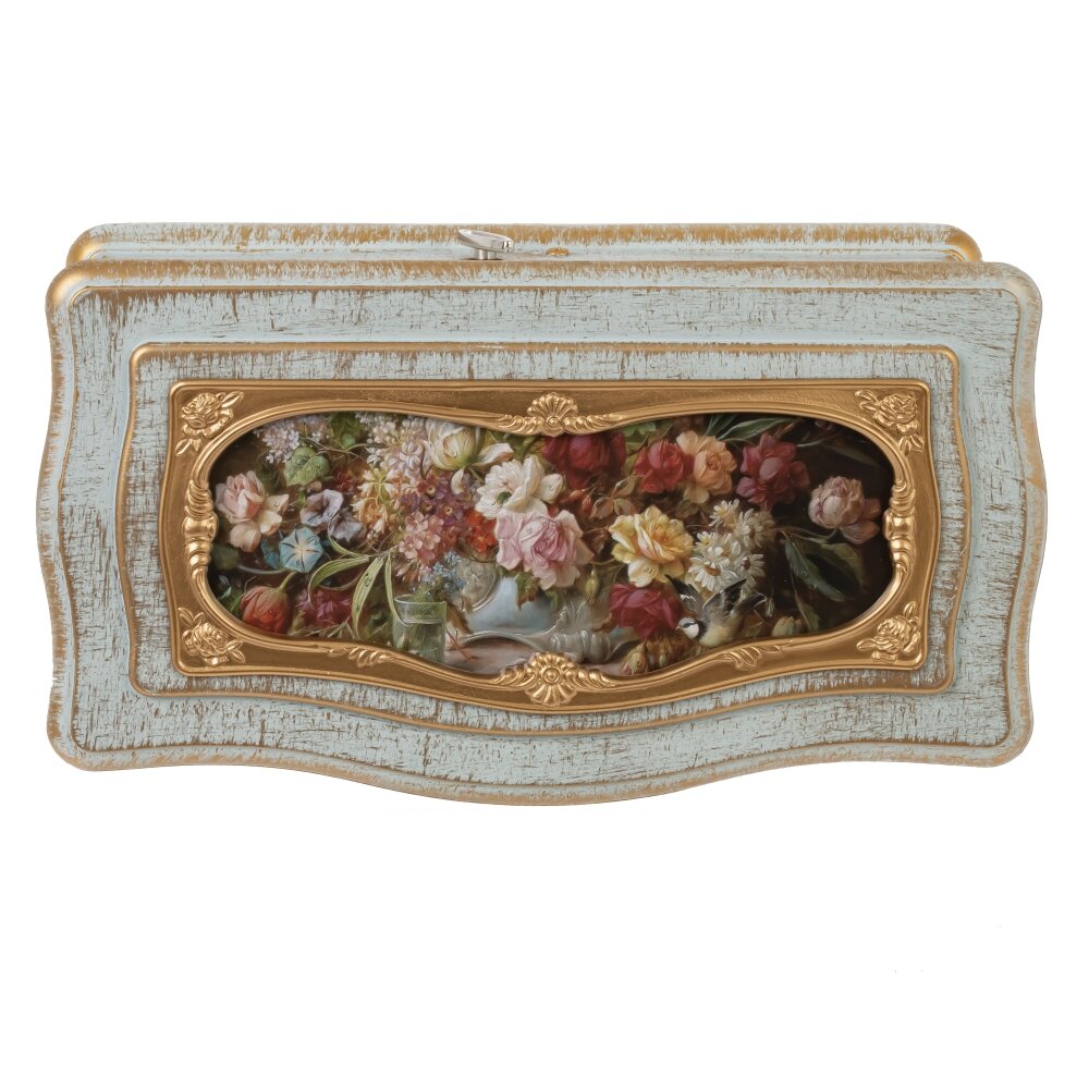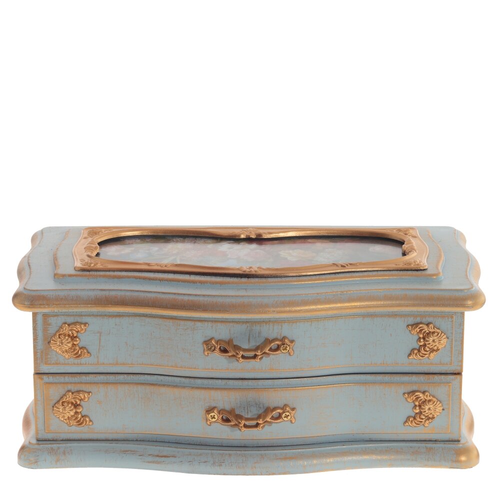 Перед вами изящная музыкальная шкатулка для украшений, выполненная в винтажном стиле. Основной материал корпуса – полимерные материалы, которые удачно имитируют старинное дерево с потертостями. Крышка шкатулки снабжена большим зеркалом, что удобно для примерки украшений. Внутри предусмотрены отдельные секции для хранения колец, браслетов и других драгоценностей. Особую атмосферу создаёт заводной музыкальный механизм: при его активации начинает звучать мелодия, а миниатюрная фигурка балерины начинает вращаться, что смотрится очень эффектно. Декоративные элементы выполнены из металла и пластика с золотистым покрытием, что придаёт шкатулке утончённый и благородный вид. Шкатулка станет не только функциональным аксессуаром для хранения украшений, но и оригинальным элементом интерьера, добавляющим уют и шарм в любой дом.