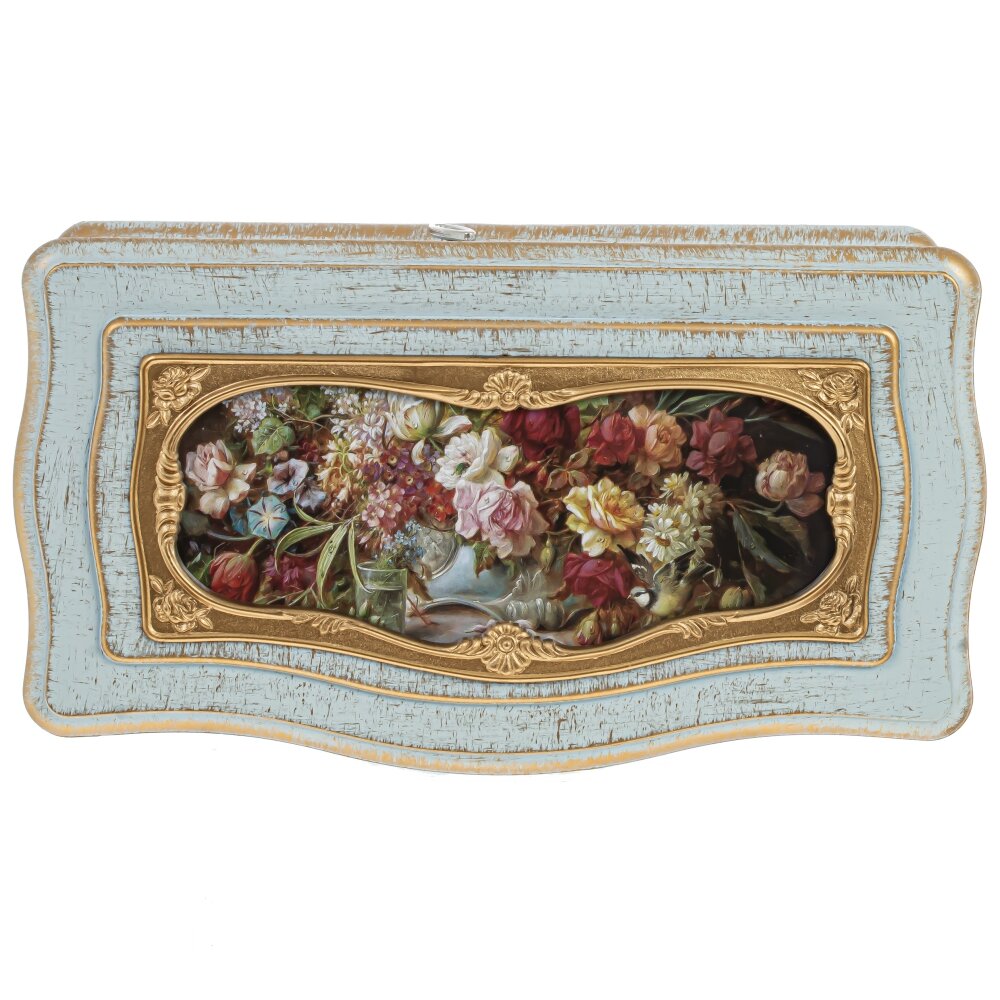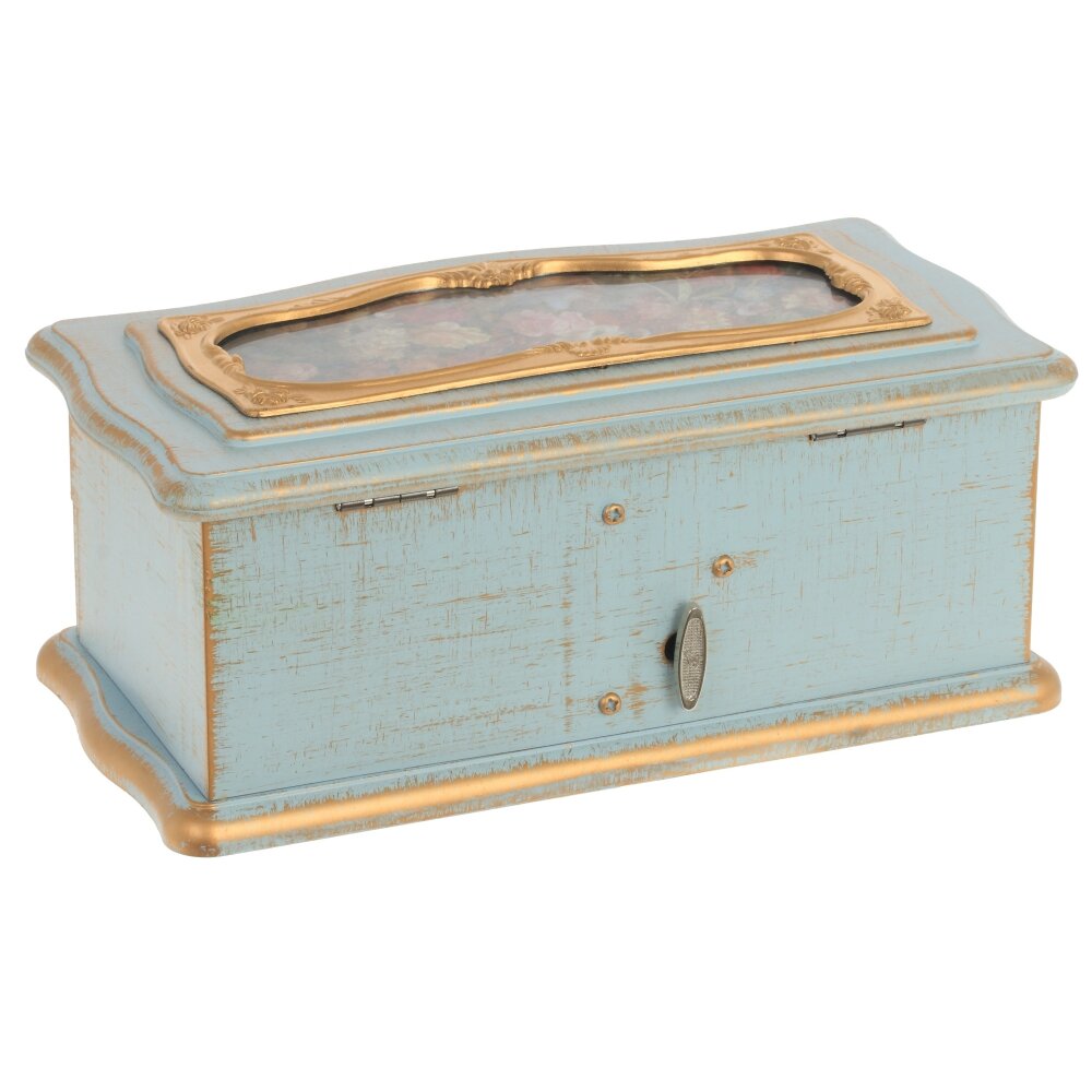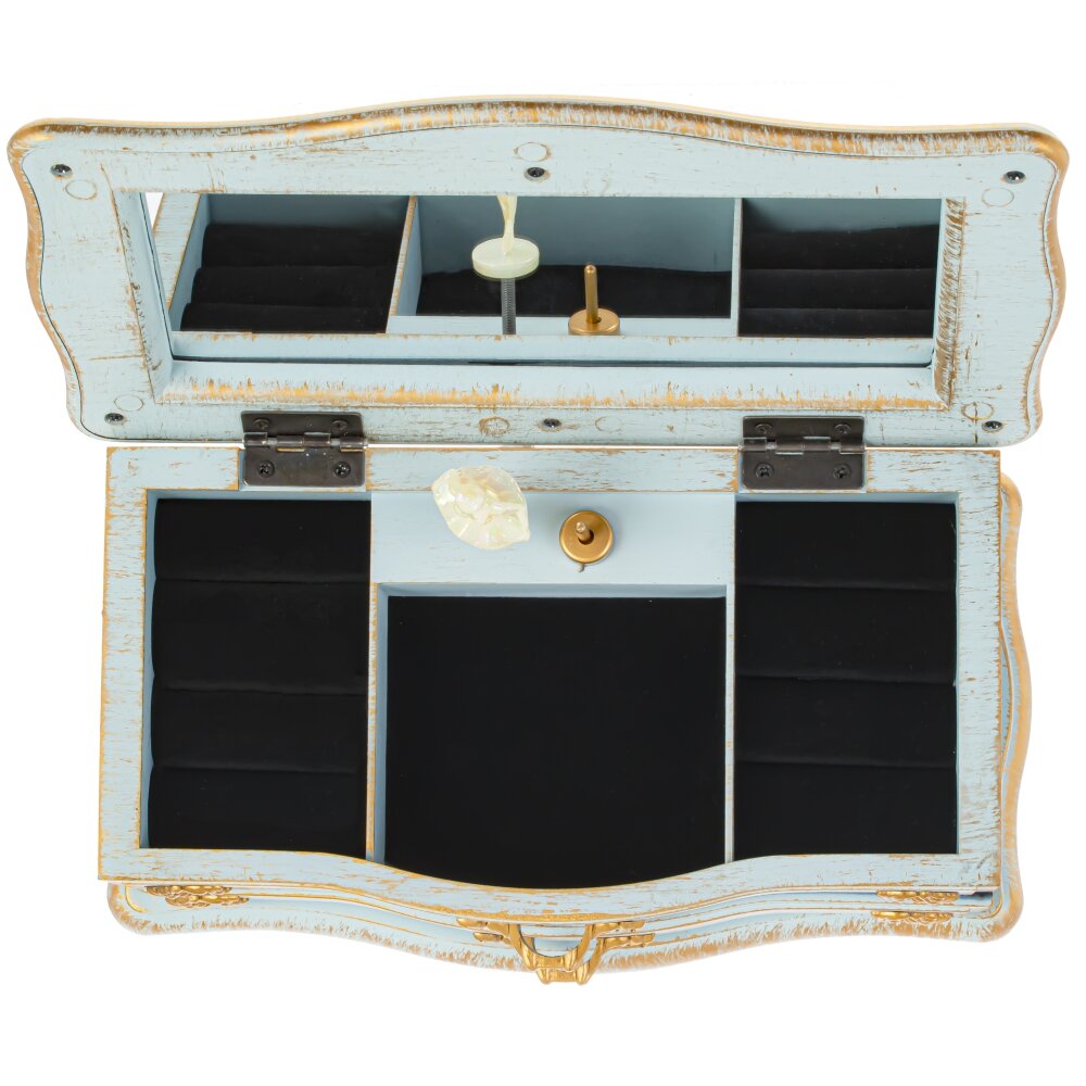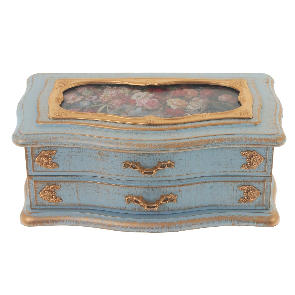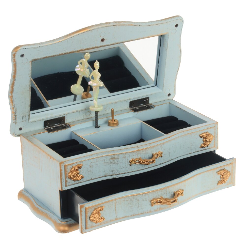 Шкатулка для украшений музыкальная, в форме "Комода" выполнена под старину. Изготовлена из полимерных материалов. Крышка декорирована цветочным рисунком, внутри с зеркалом. Имеет выдвижной ящичек. Работает от заводного ключа.