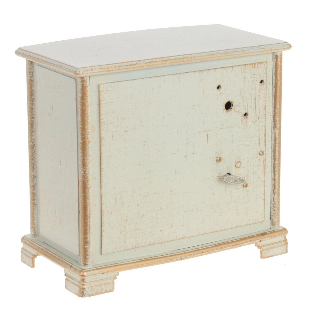 Шкатулка для украшений с часами в форме старинного "Комода". Боковая дверца и три ящичка функциональны, открываются. Изготовлена из полимерных материалов. Круглый циферблат часов диаметром 5 см с арабскими цифрами, имеет три стрелки: часовую, минутную, секундную. Механизм - кварцевый. Работает от батареек AA 1 шт. (в комплект не входит)
